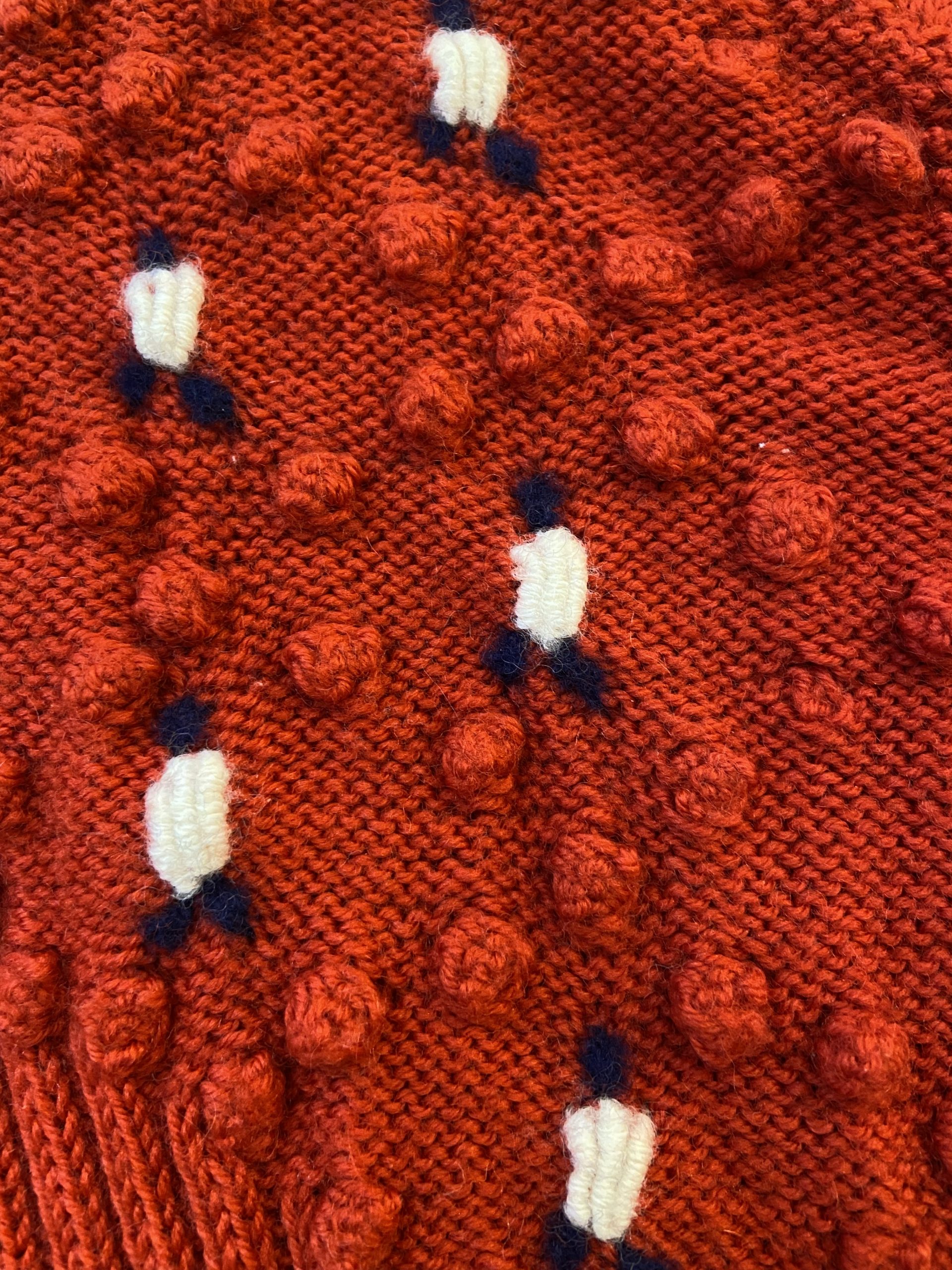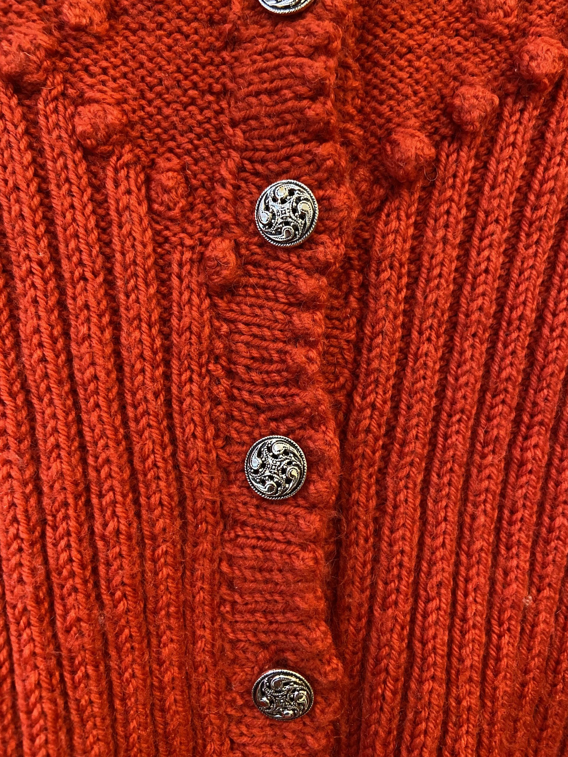 This rare 1940s hand-knitted bobble cardigan exemplifies post-war craftsmanship, when clothing was often made by hand with care and creativity. The intricate bobble texture, floral embroidery, and ornate buttons highlight a unique blend of artistry and practicality. Designed during a time when fashion was both resourceful and expressive, this cardigan is a timeless statement piece for vintage knitwear collectors and slow-fashion advocates.