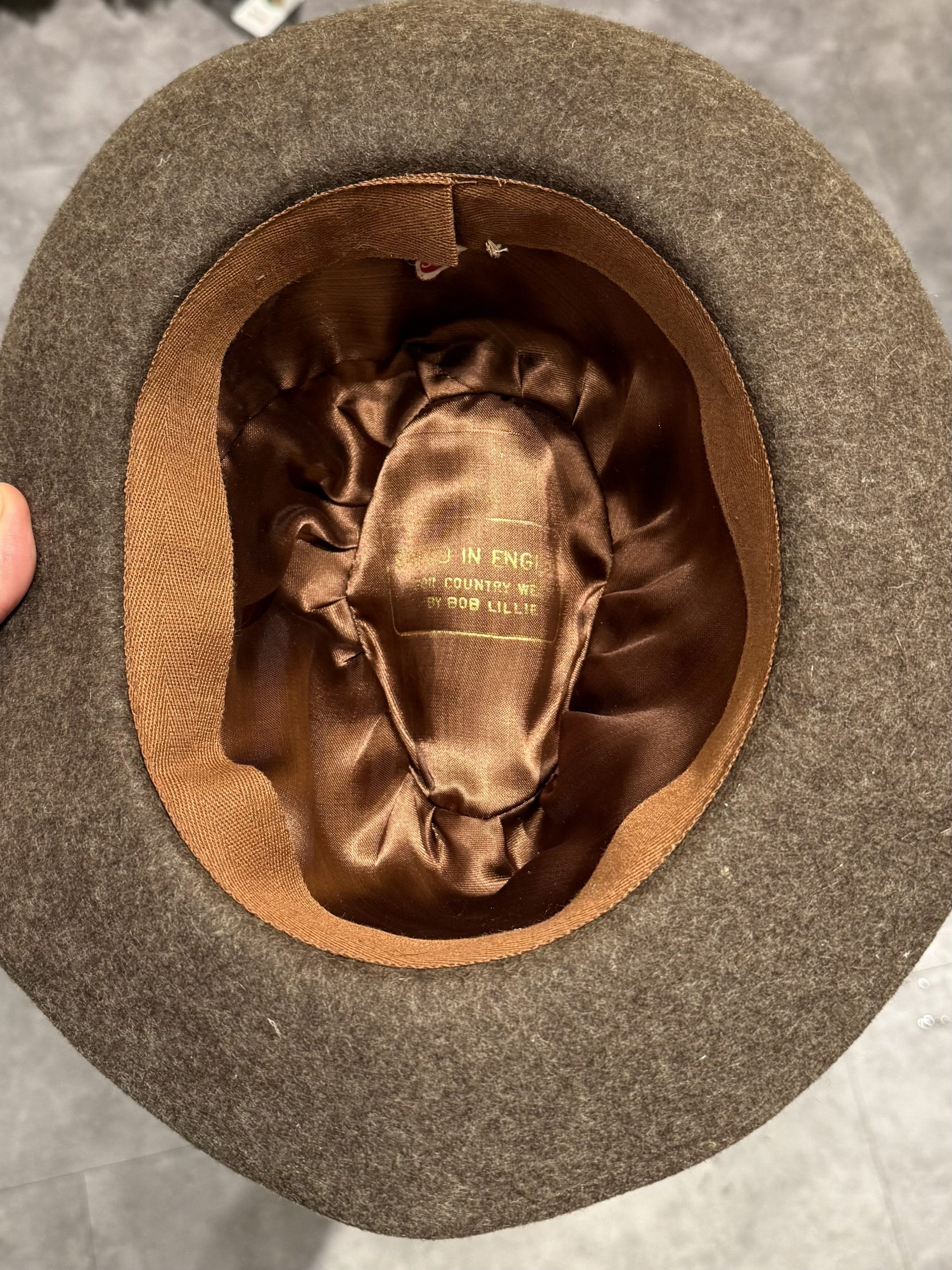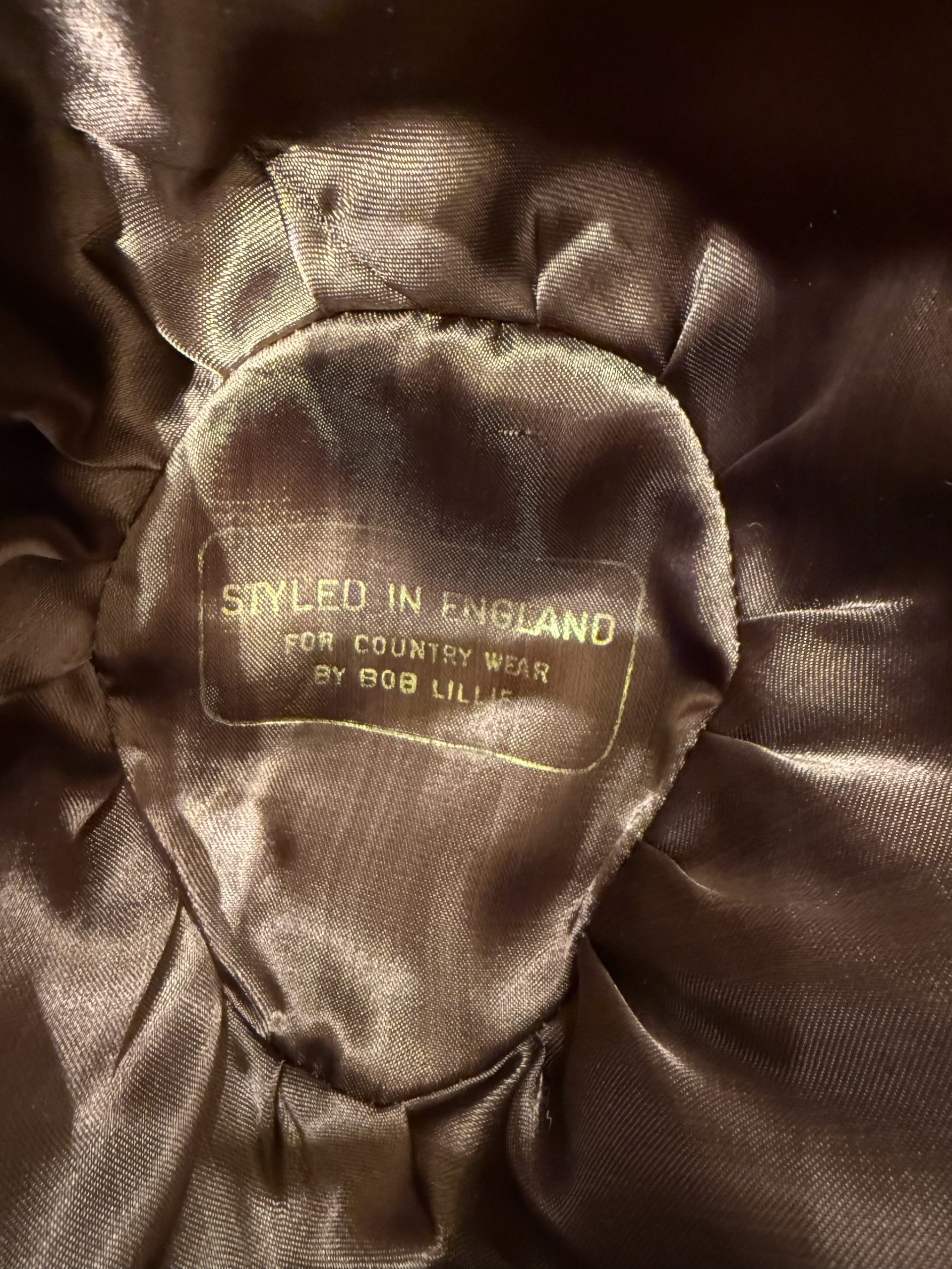 Bob Lillie was one of the mid-century British country-outfitter hatmakers producing practical, well-constructed trilbies and fedoras for rural dress. This style sits firmly in the late 1960s to early 1970s period, identifiable by its gathered satin lining, gold foil branding, and softly structured felt body. Traditionally worn for countryside pursuits, these hats embody the era’s functional yet refined English country aesthetic. Collectible today for their craftsmanship and understated rustic charm.