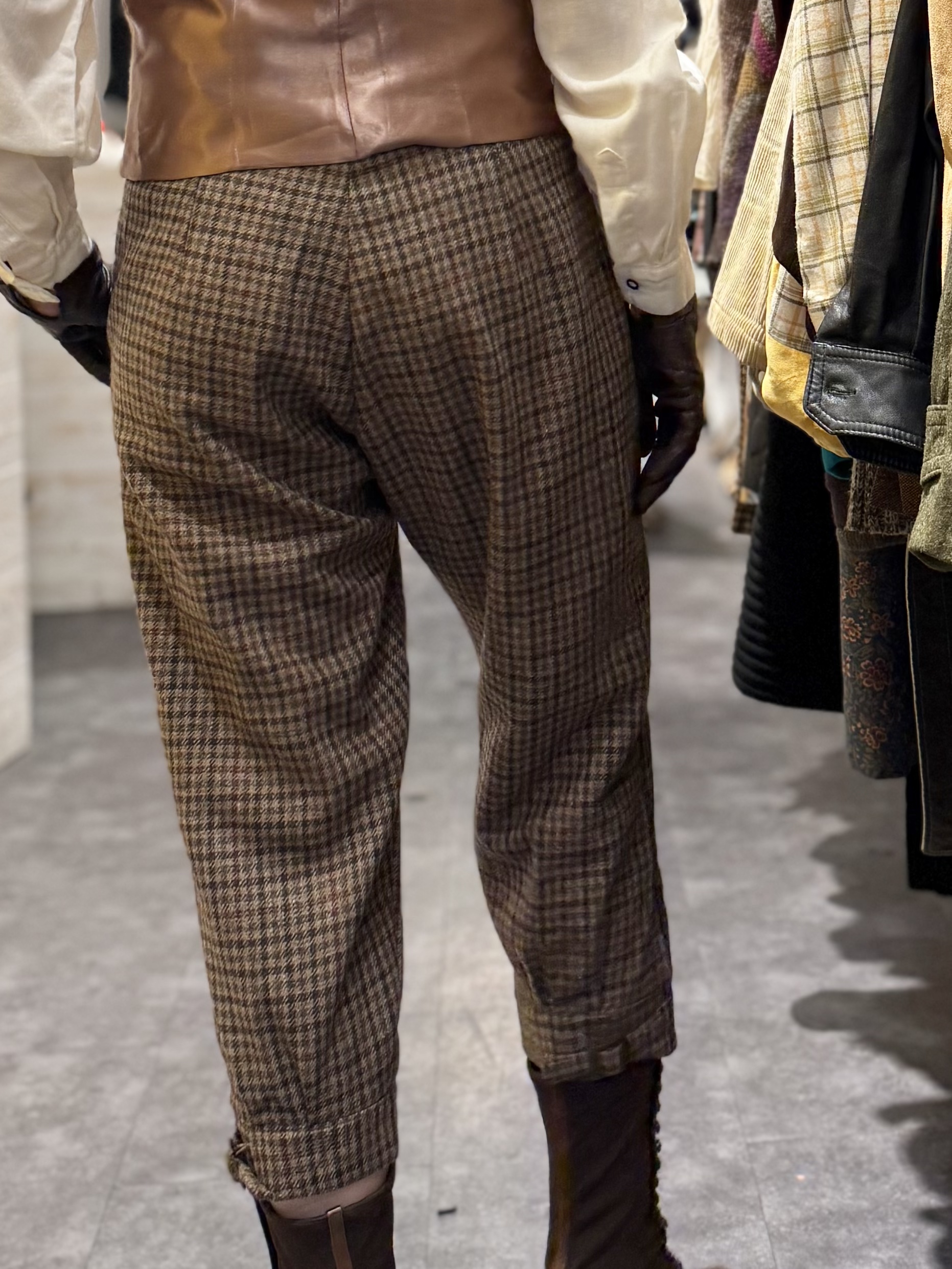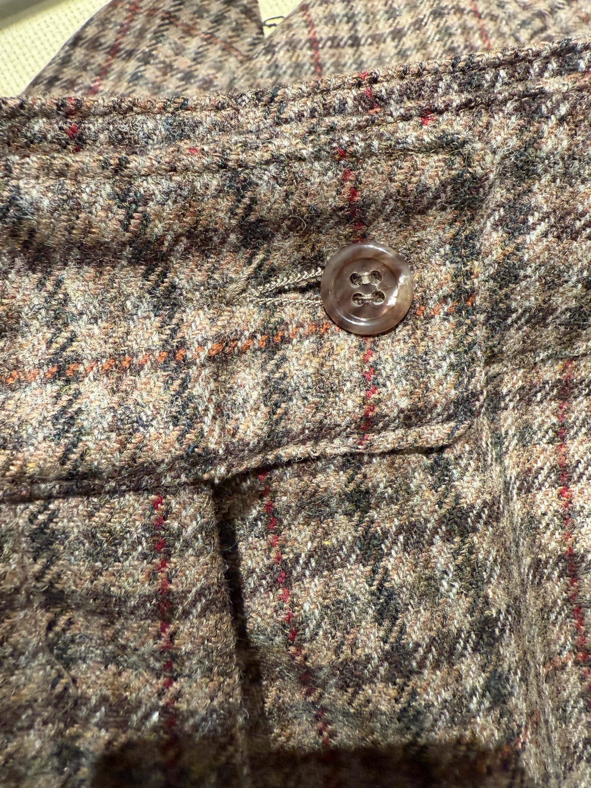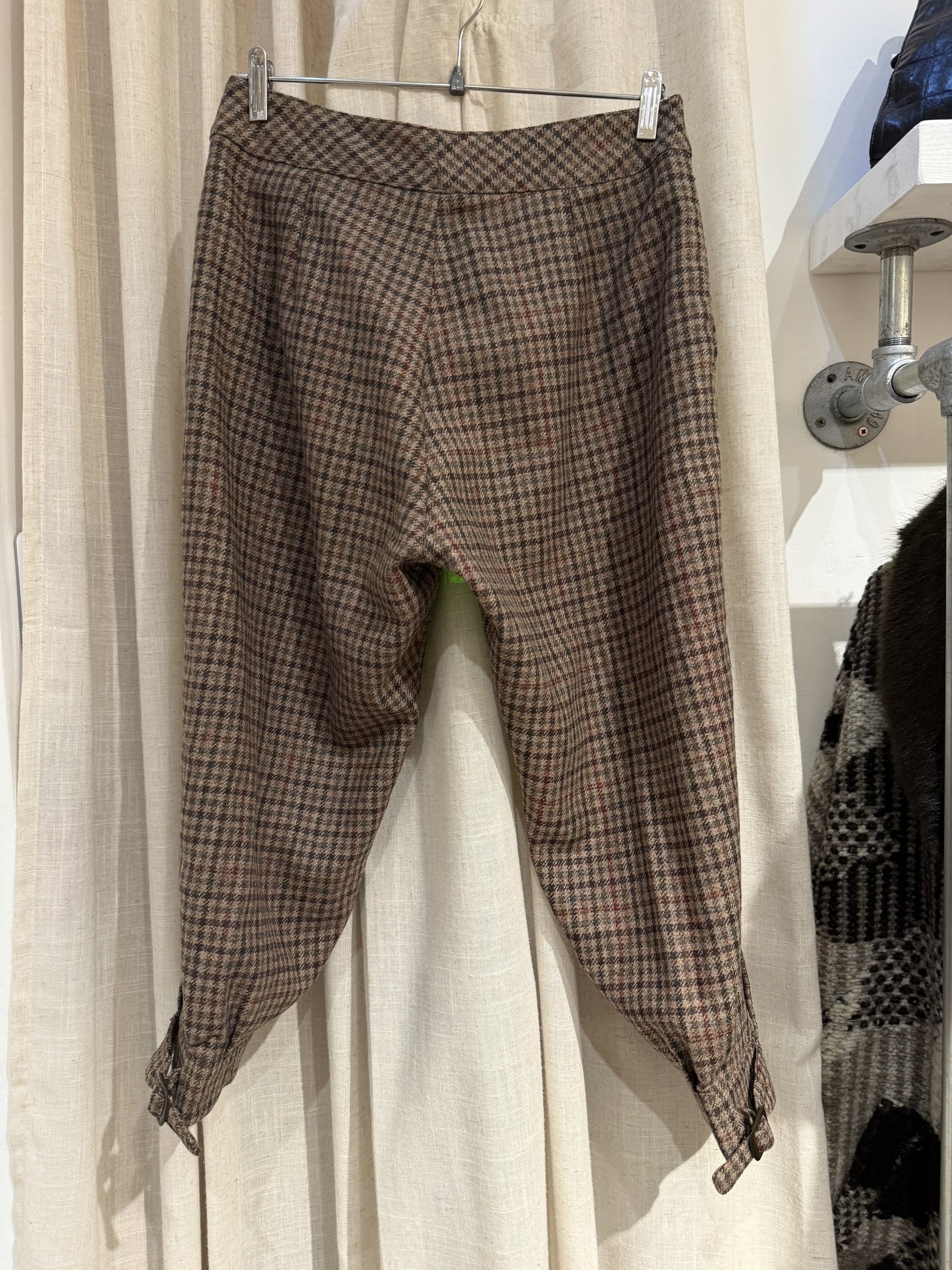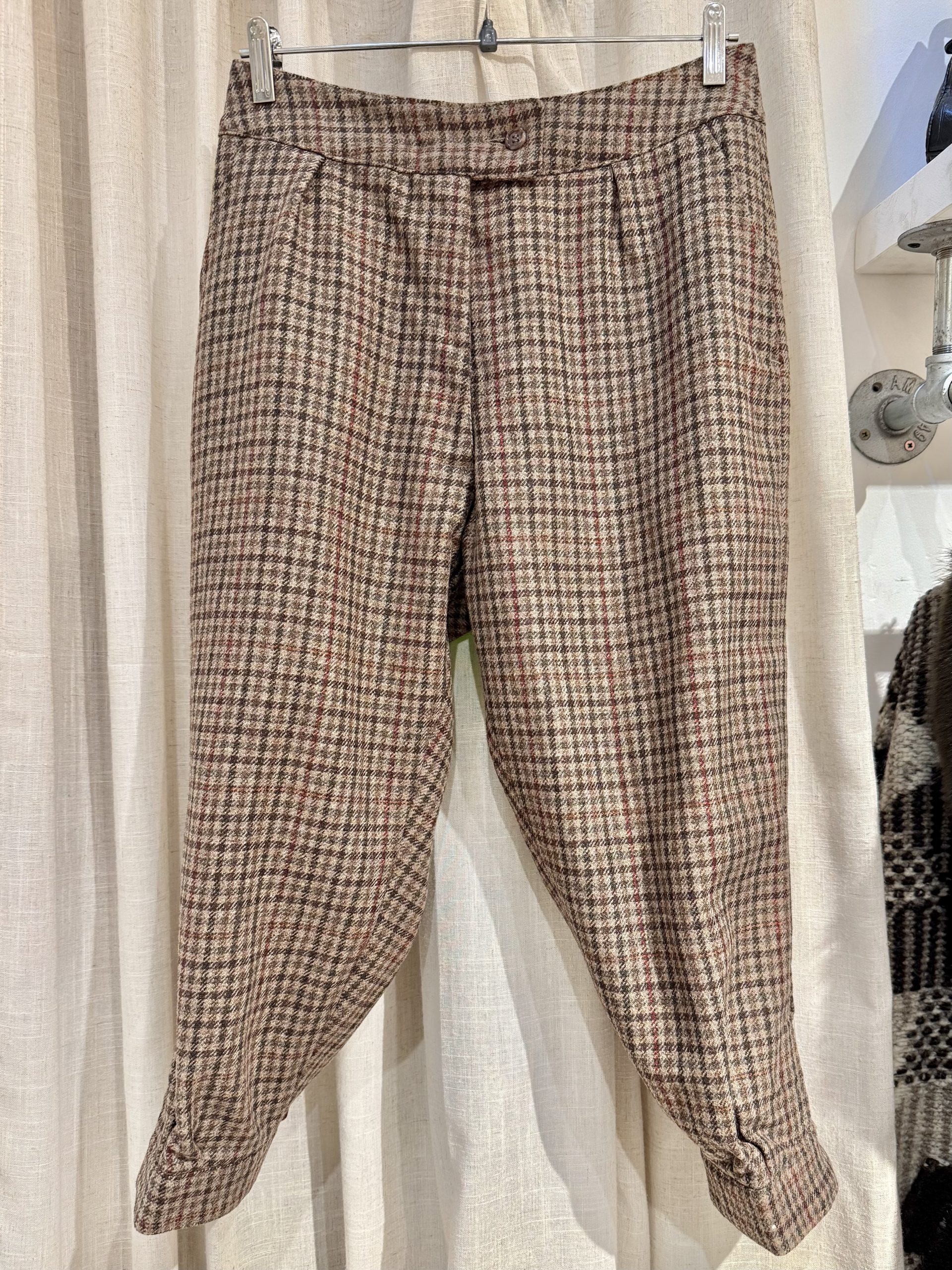 Though unlabelled, these 1960s wool tweed jodhpurs are crafted in high-quality checked tweed typical of British and European countryside tailoring of the decade. The presence of a locking overlock stitch, reinforced inner strap, and structured ankle shaping indicates skilled construction designed for active wear, travel, or equestrian use. Wool tweed blends were widely favoured for their warmth, durability, and natural weather resistance in outdoor garments of the era.