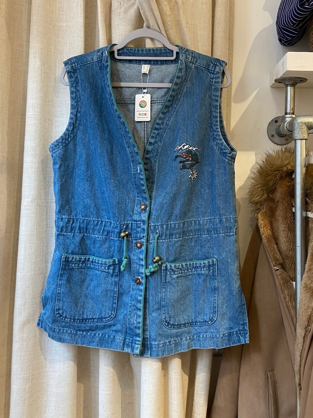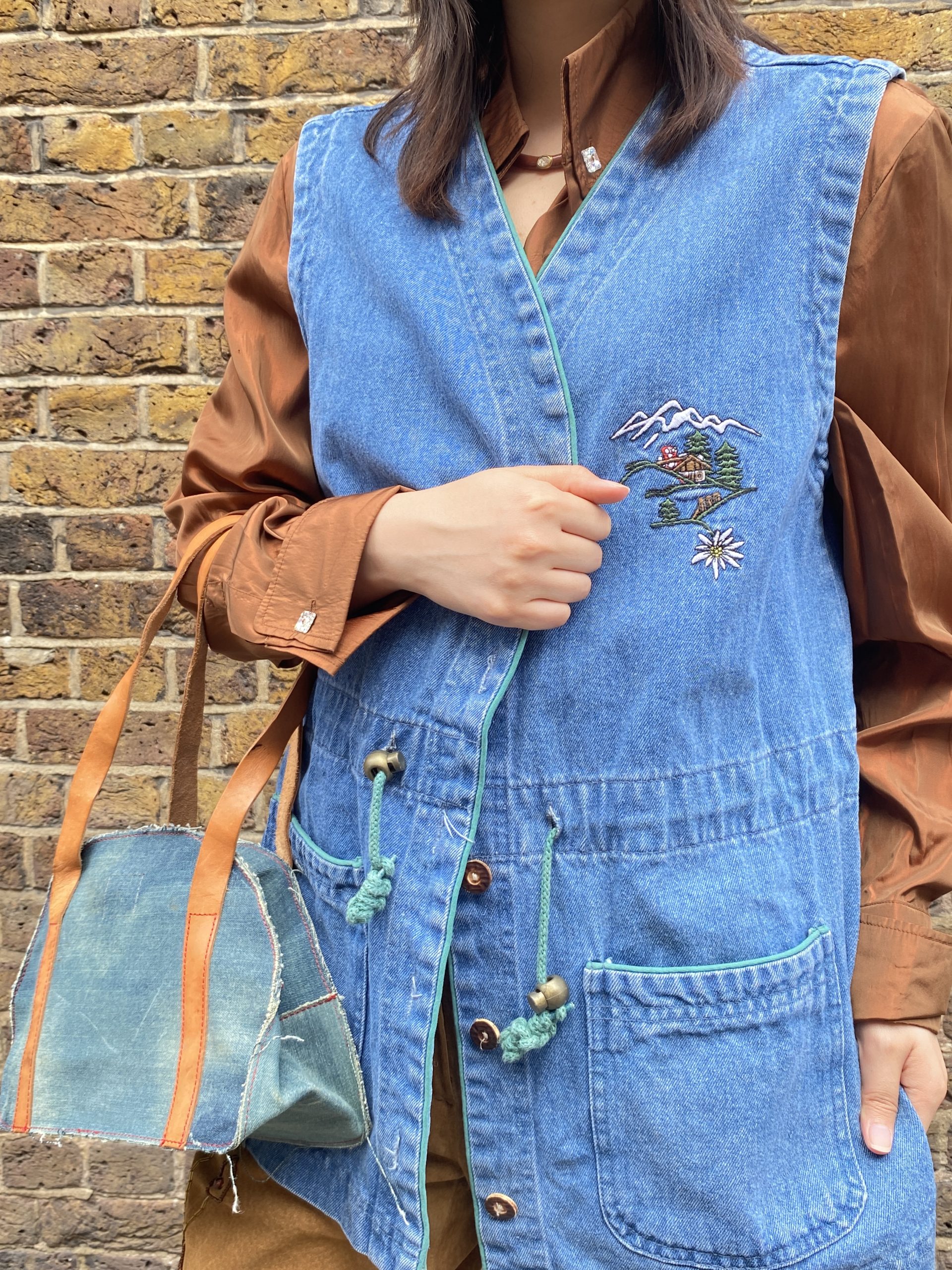 This 1970s embroidered denim waistcoat is inspired by Alpine folkwear, blending functionality with whimsical charm. During the late 1970s to early 1980s, such pieces were popular for their durability and handcrafted appeal. With its detailed embroidery and practical features, this vest is a rare find for vintage lovers and collectors of European folk-inspired fashion.