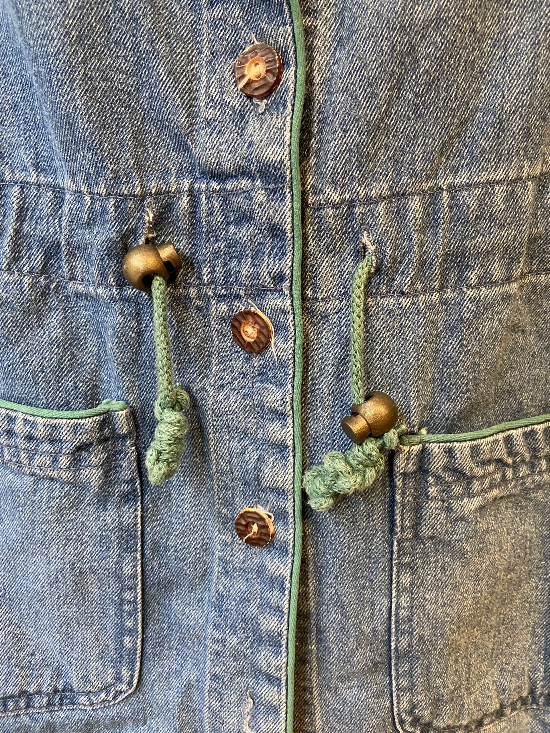 Excellent vintage condition with no visible flaws. All buttons, embroidery, and drawstring details are intact. The denim has a beautifully worn-in patina typical of high-quality vintage pieces.