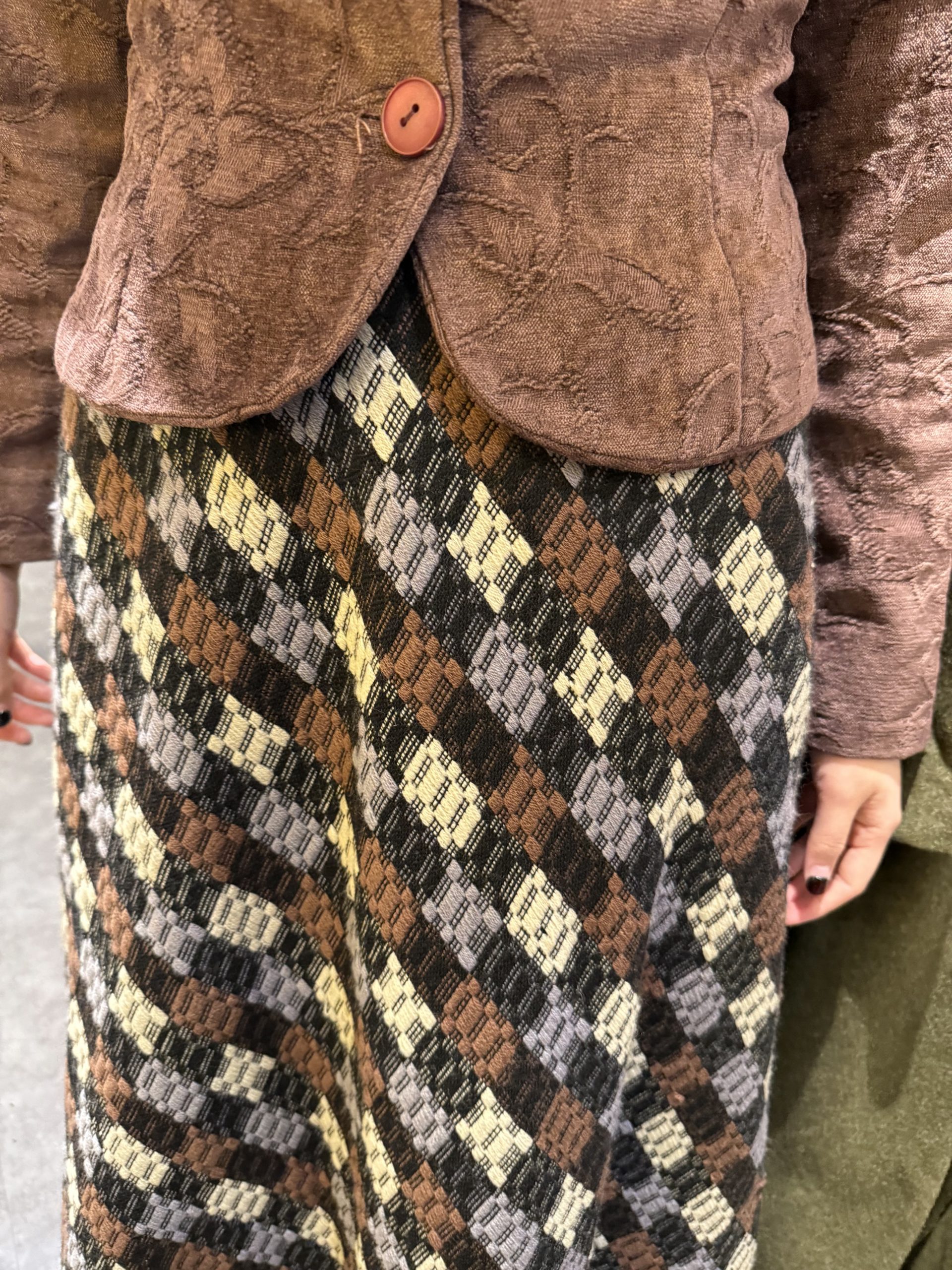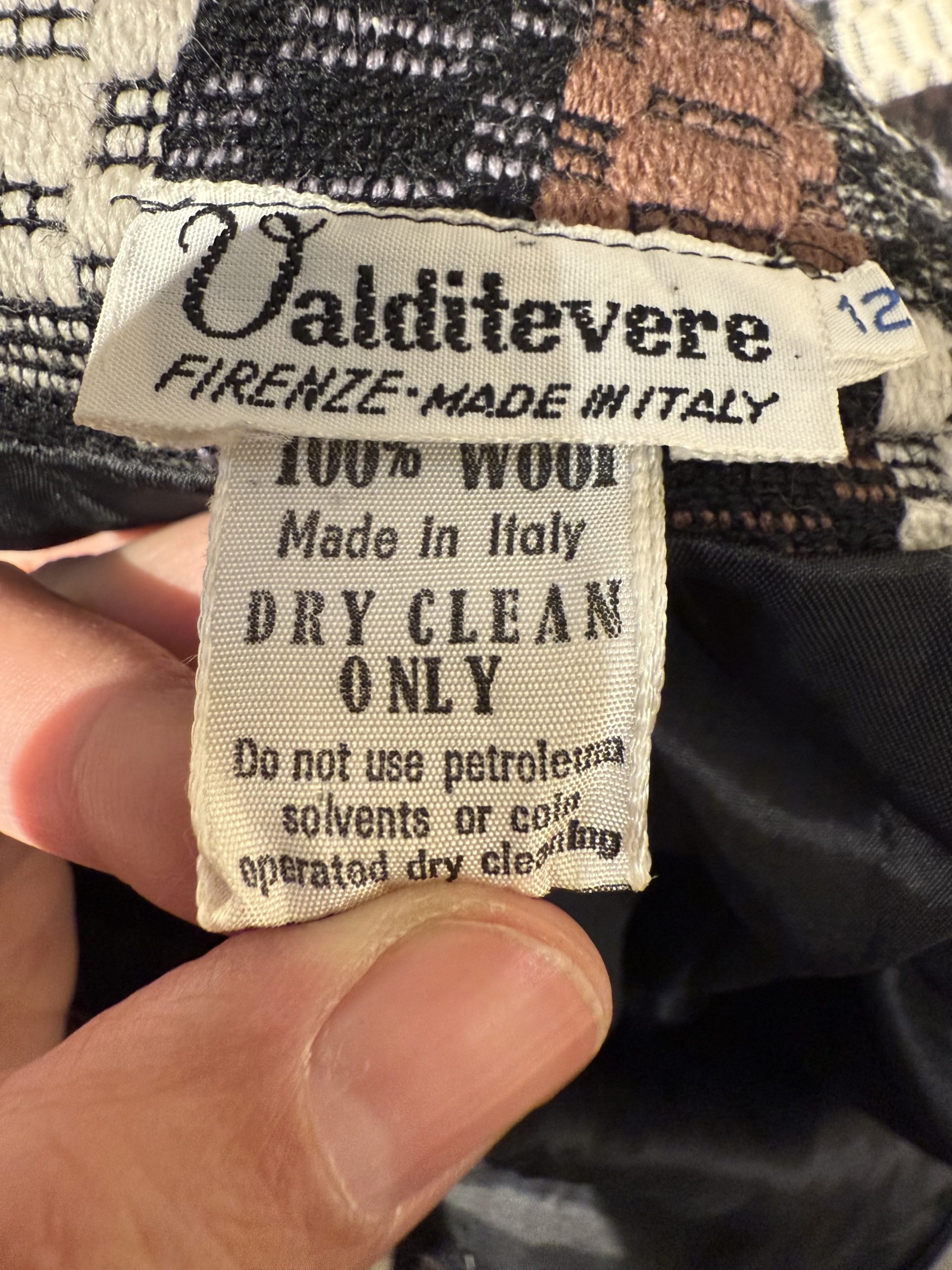 Valditevere Firenze was a Florentine label active through the 1960s–70s, known for fine wool tailoring and Italian textile craftsmanship. Named after Tuscany’s Tiber Valley region, the brand drew on a local tradition of high-quality wool production. Comparable to labels such as Mirsa and Luisa Spagnoli, pieces like this 1970s Italian wool skirt reflect boutique-level design with richly textured checks, precise pattern placement, and a flattering, elongated silhouette that feels both graphic and soft.