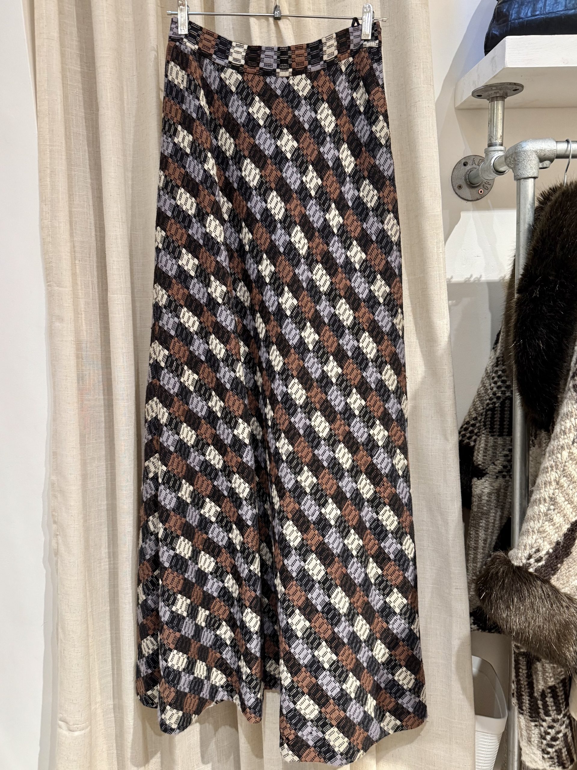This elegant 1970s Italian wool skirt by Valditevere Firenze is a full-length checked maxi in warm brown, lilac, cream, and black pure wool. Cut in a sweeping A-line silhouette with a side metal zip and full lining, it’s a beautiful 1970s Italian boutique piece from Doreen’s wardrobe.