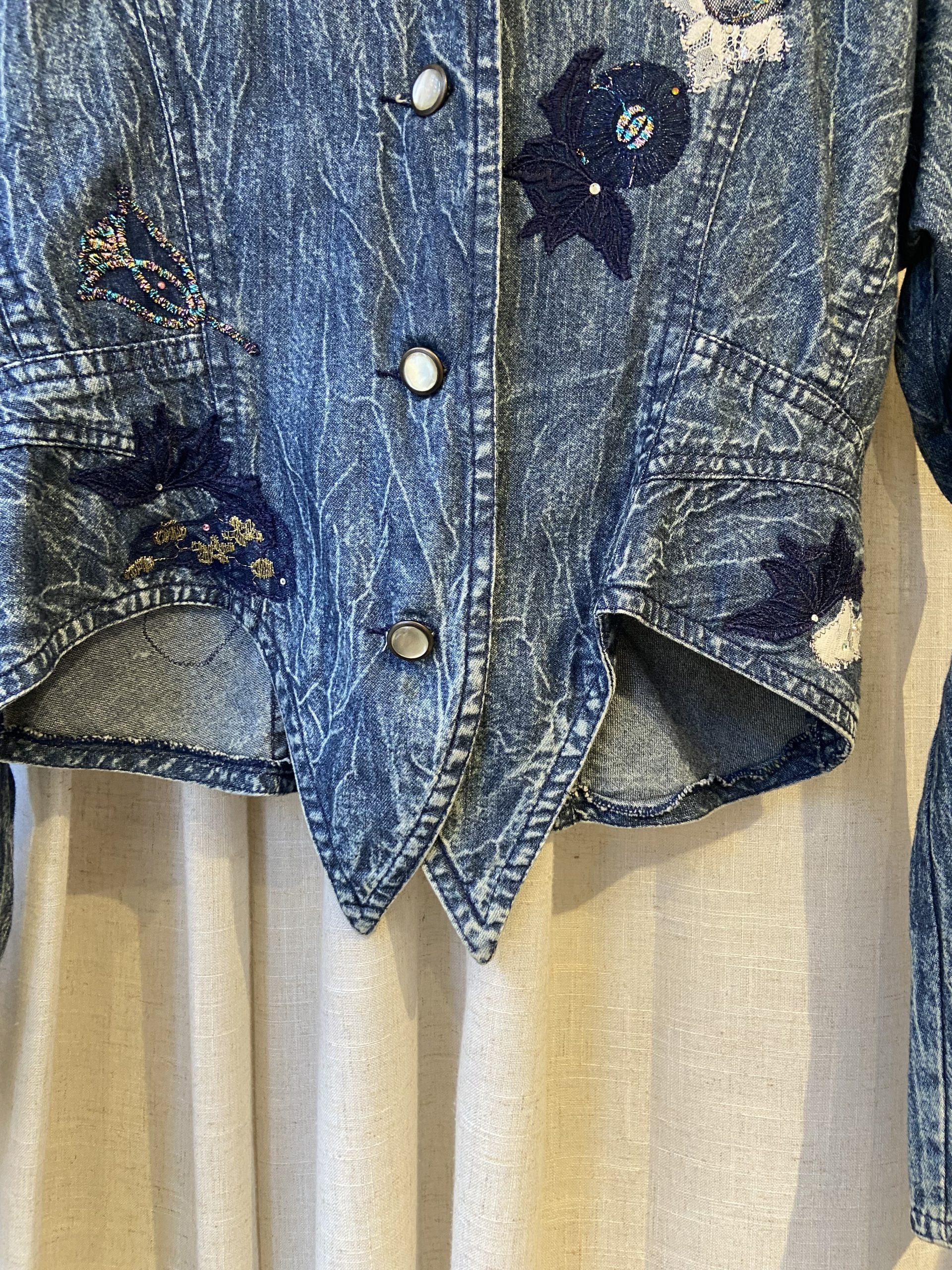 This 1980s Marciano denim jacket embodies everything that made the decade iconic: bold embellishments, experimental cuts, and a fearless approach to fashion. The embroidery makes this piece particularly special — intricate florals cascading across the shoulders, chest, and back bring artistry to utilitarian denim. The pointed asymmetrical hem adds drama and marks it as a true statement jacket.