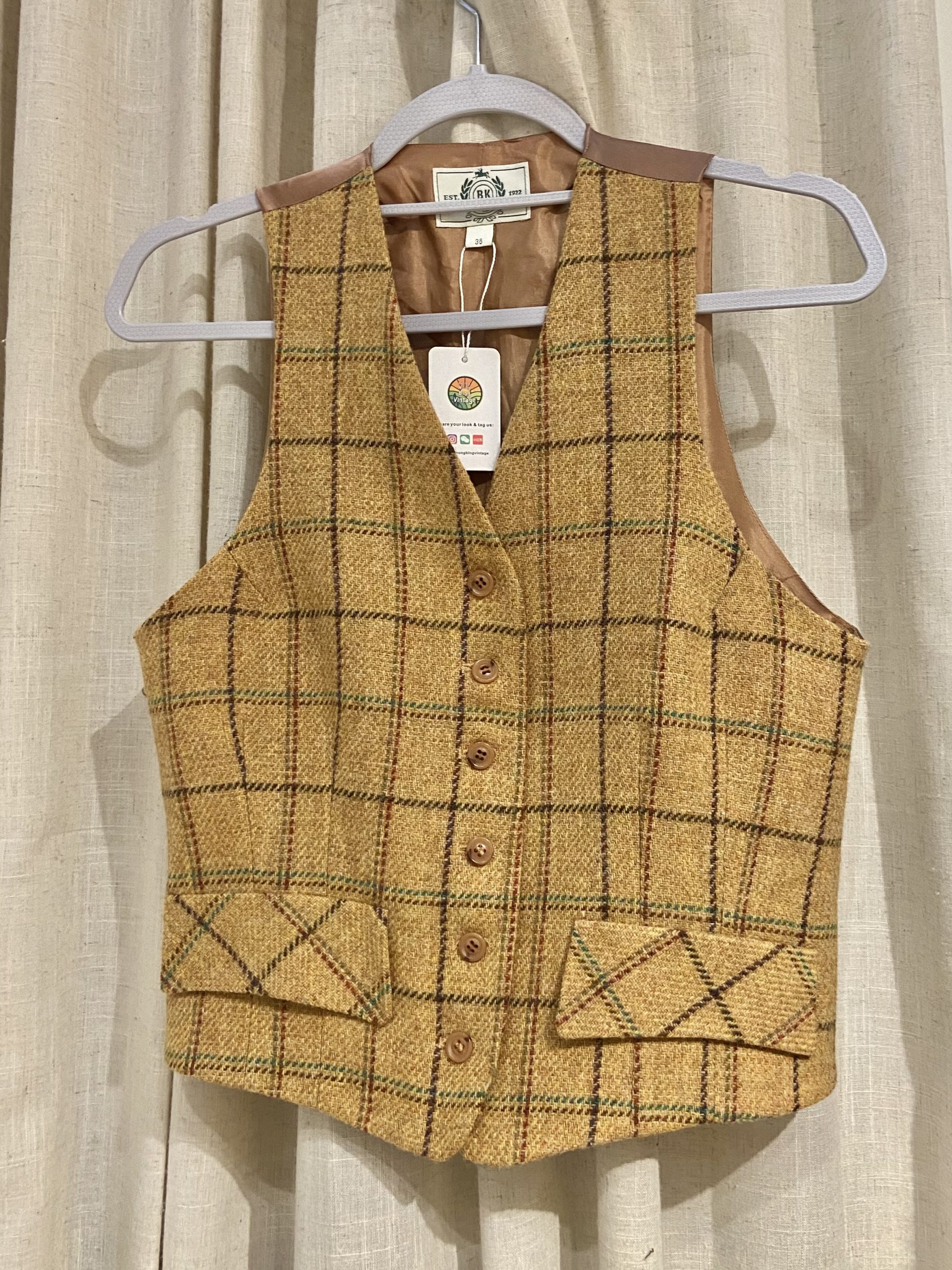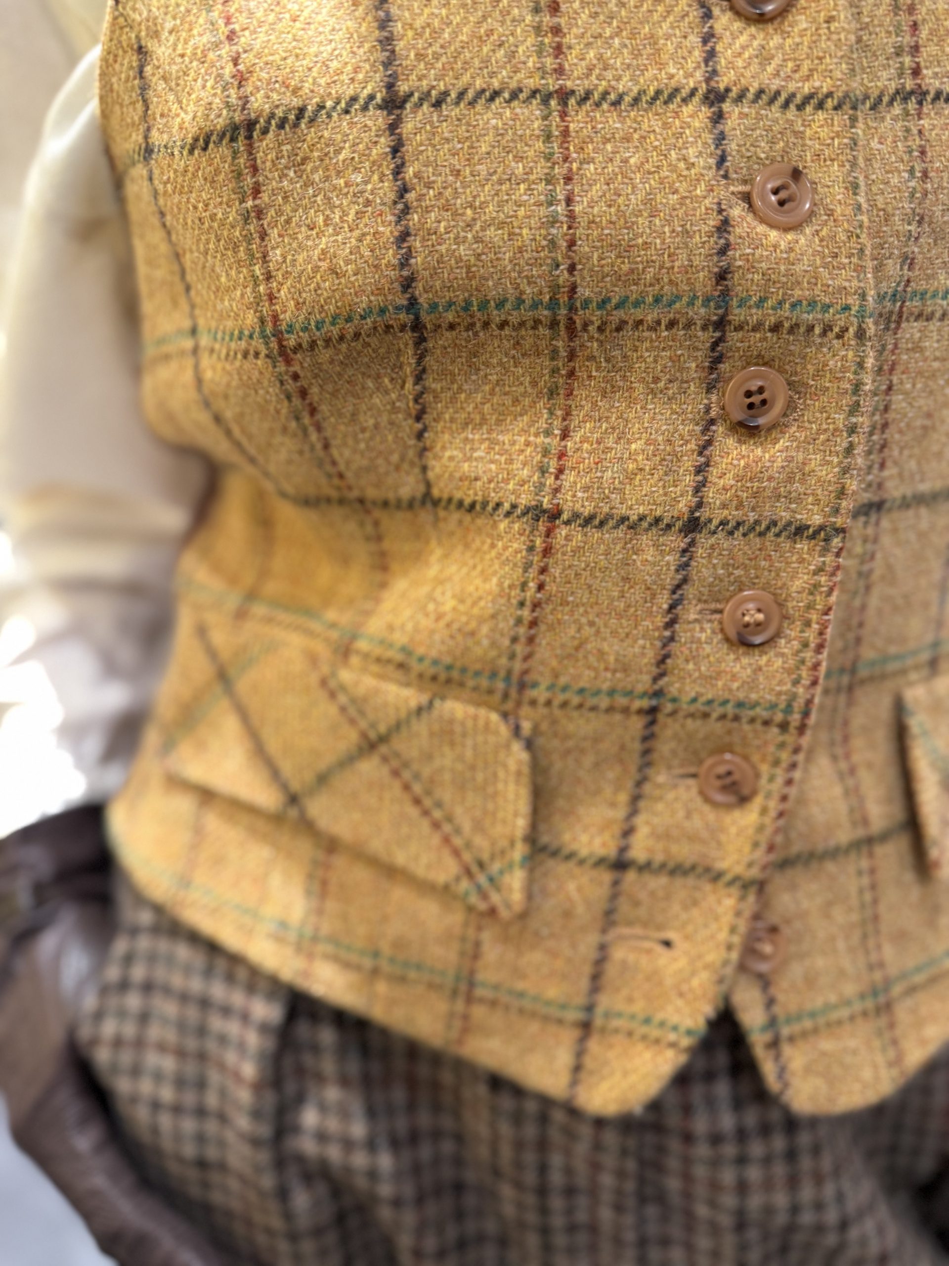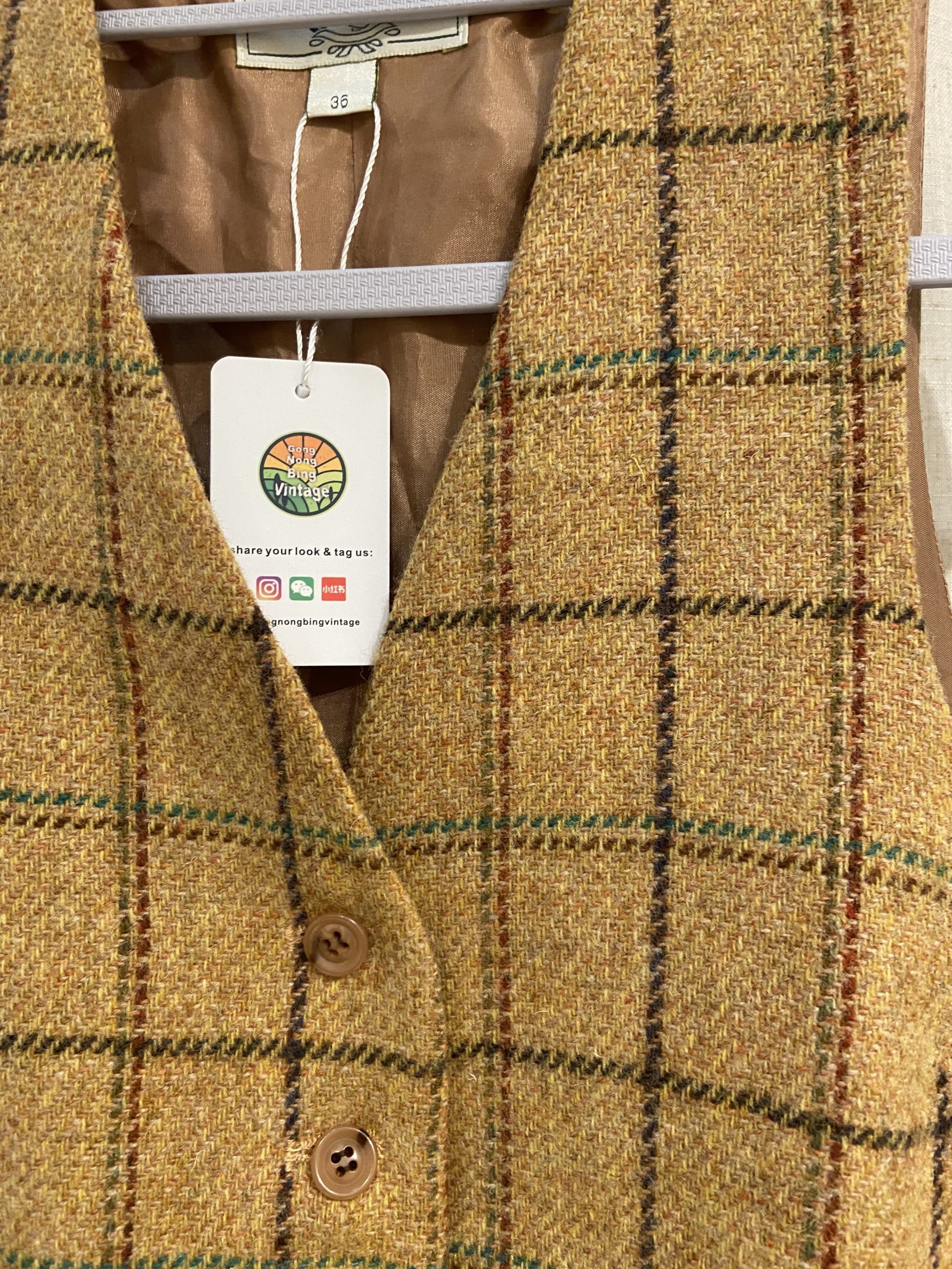 - Colour: Warm mustard-gold tweed with green and red windowpane check