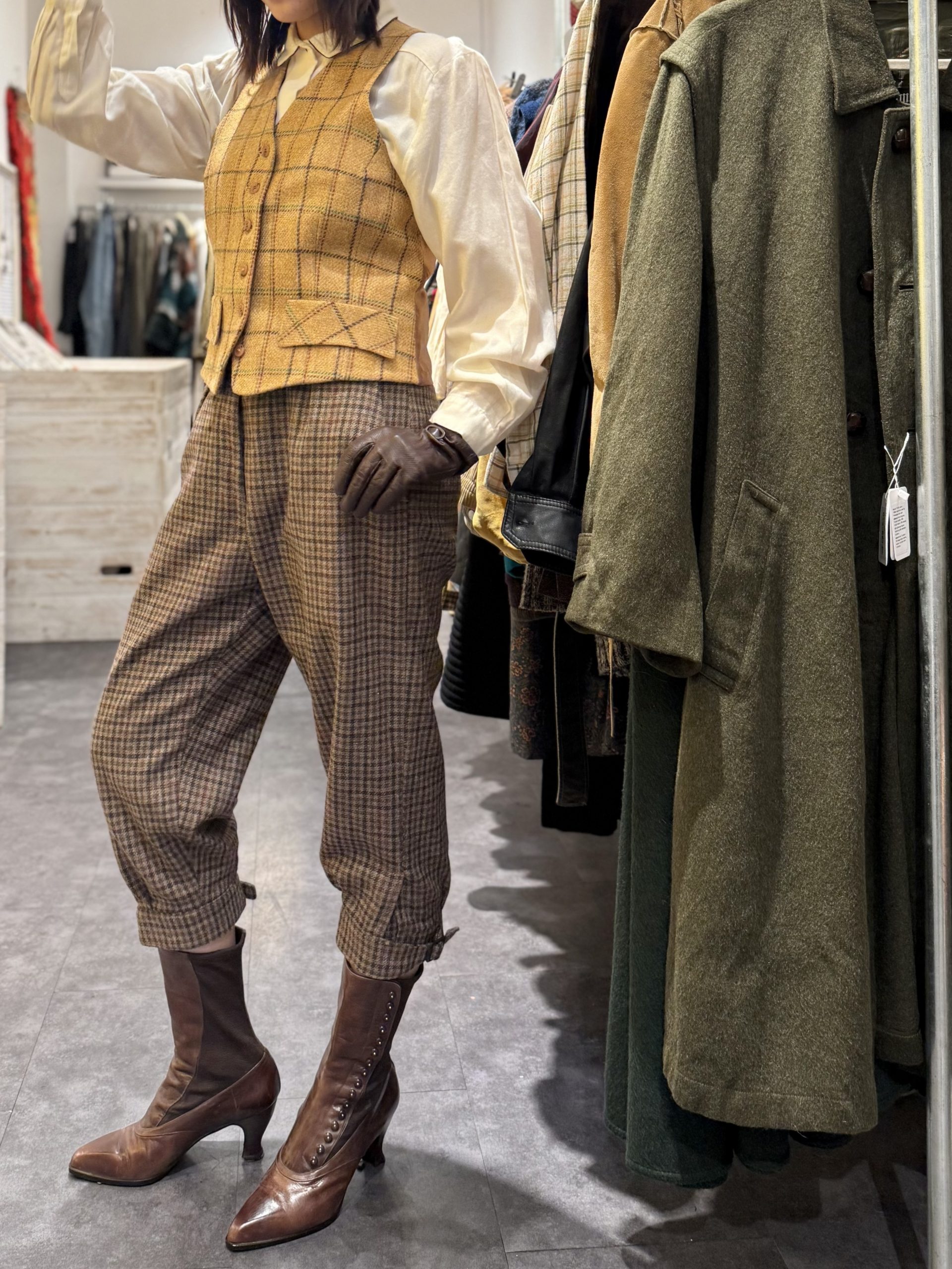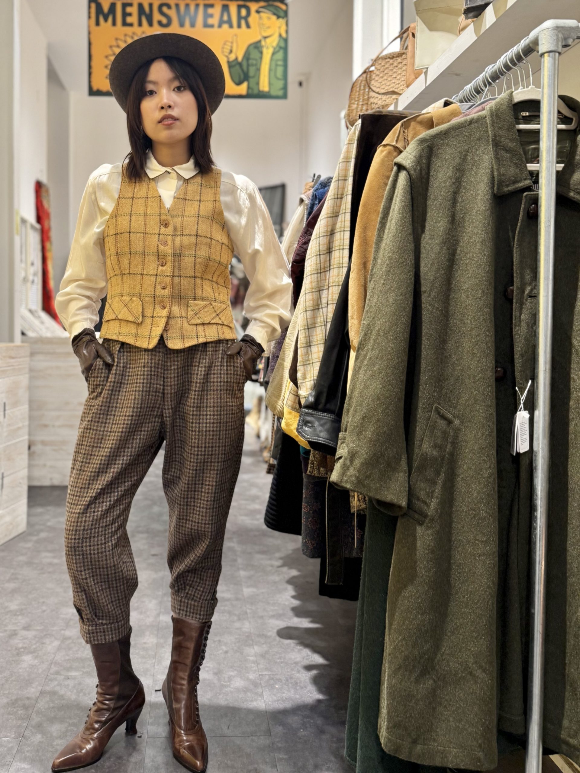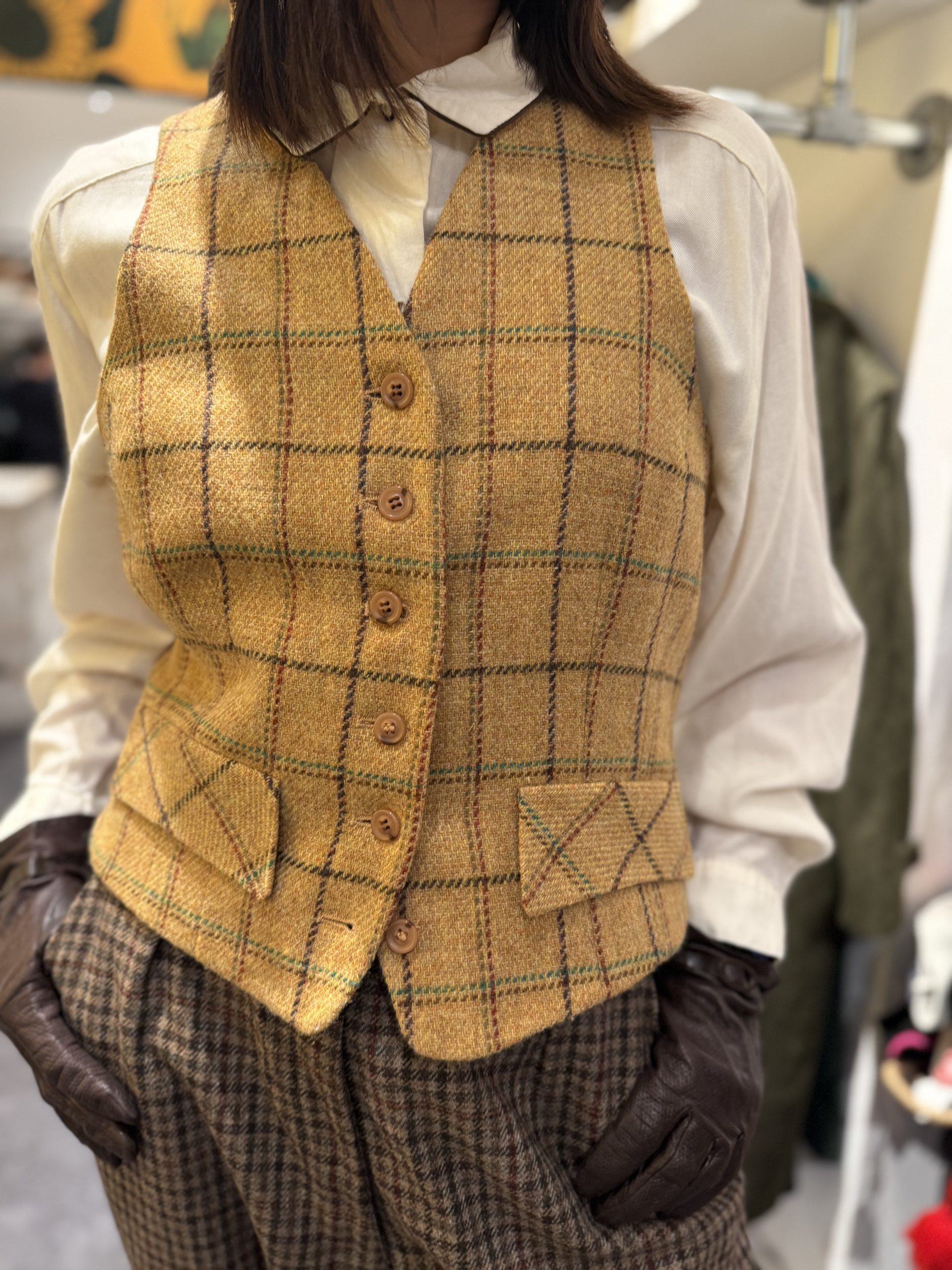 - Colour: Warm mustard-gold tweed with green and red windowpane check