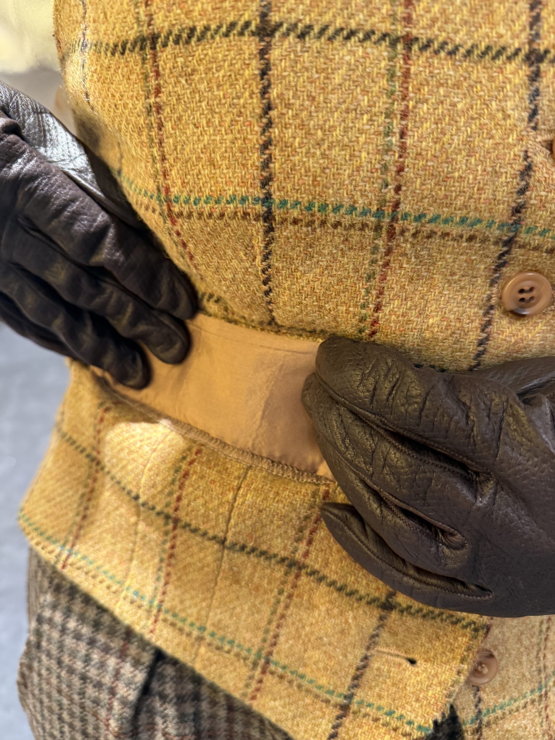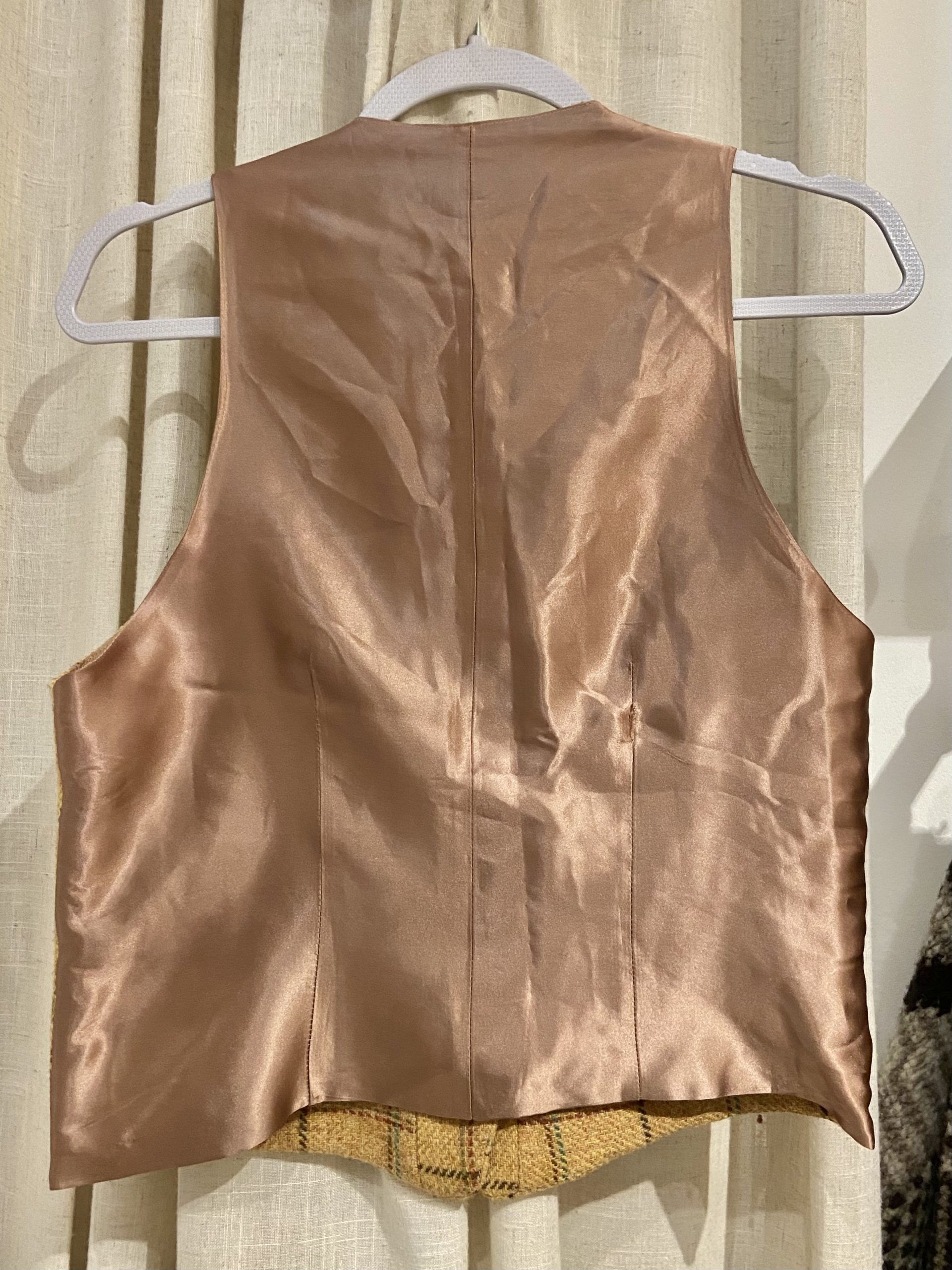 The colourway and construction details — including the seven-button fastening, satin back, and structured pocket flaps — place this piece firmly in the late 1980s to early 1990s, when warm-toned tweeds became increasingly popular in rural and town-and-country fashion. A quality example of British tailoring using authentic Scottish textiles.
