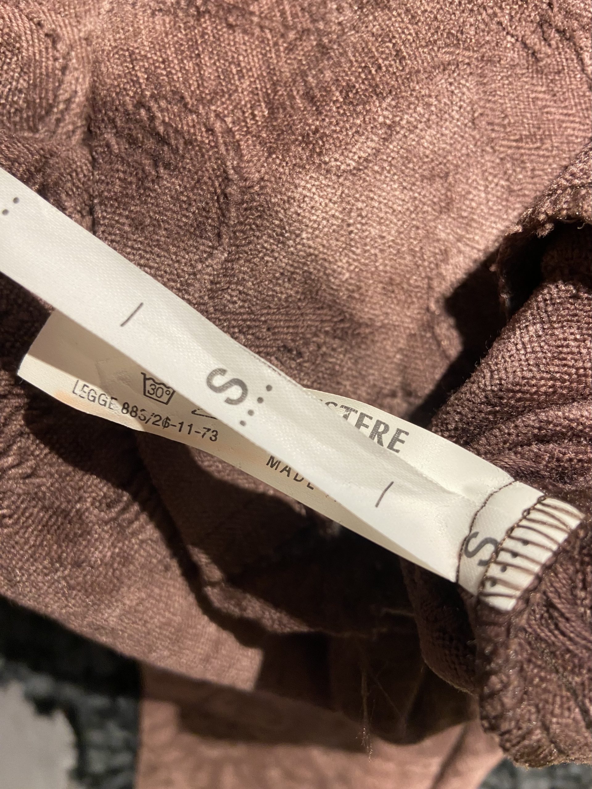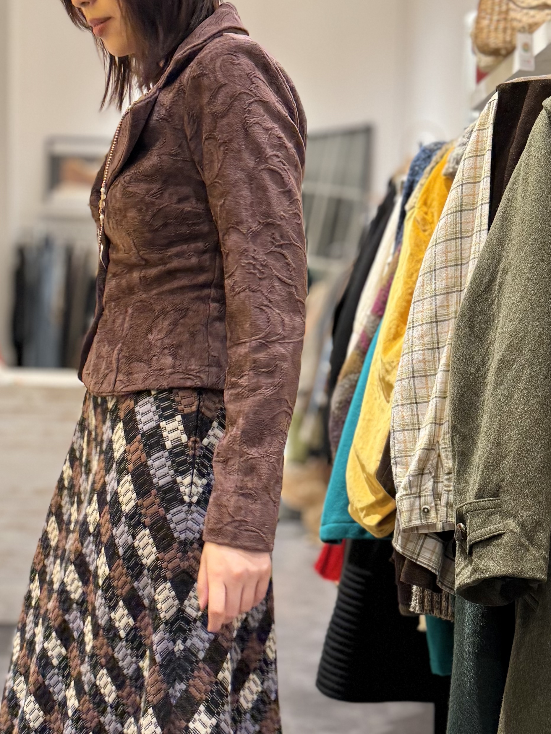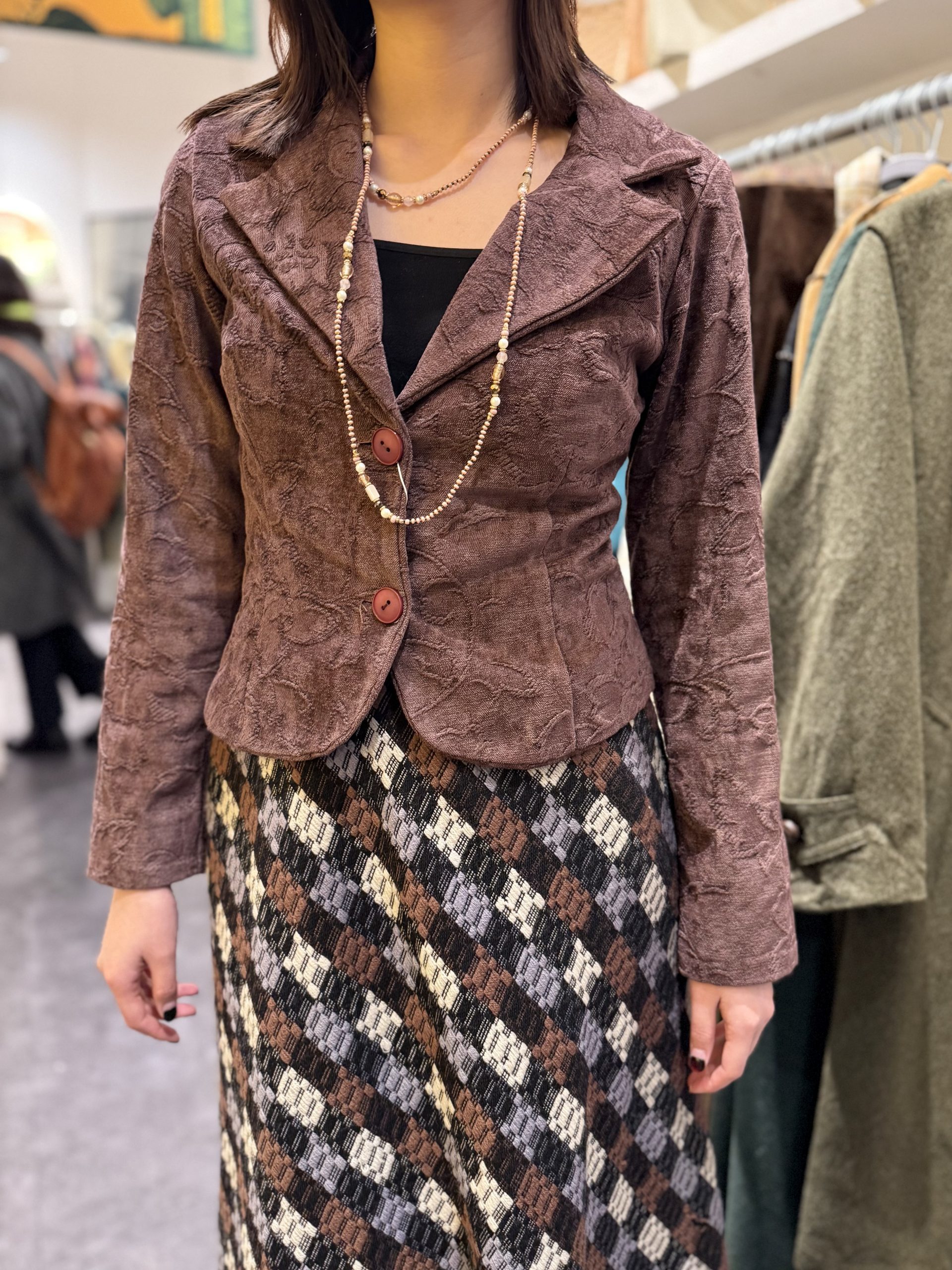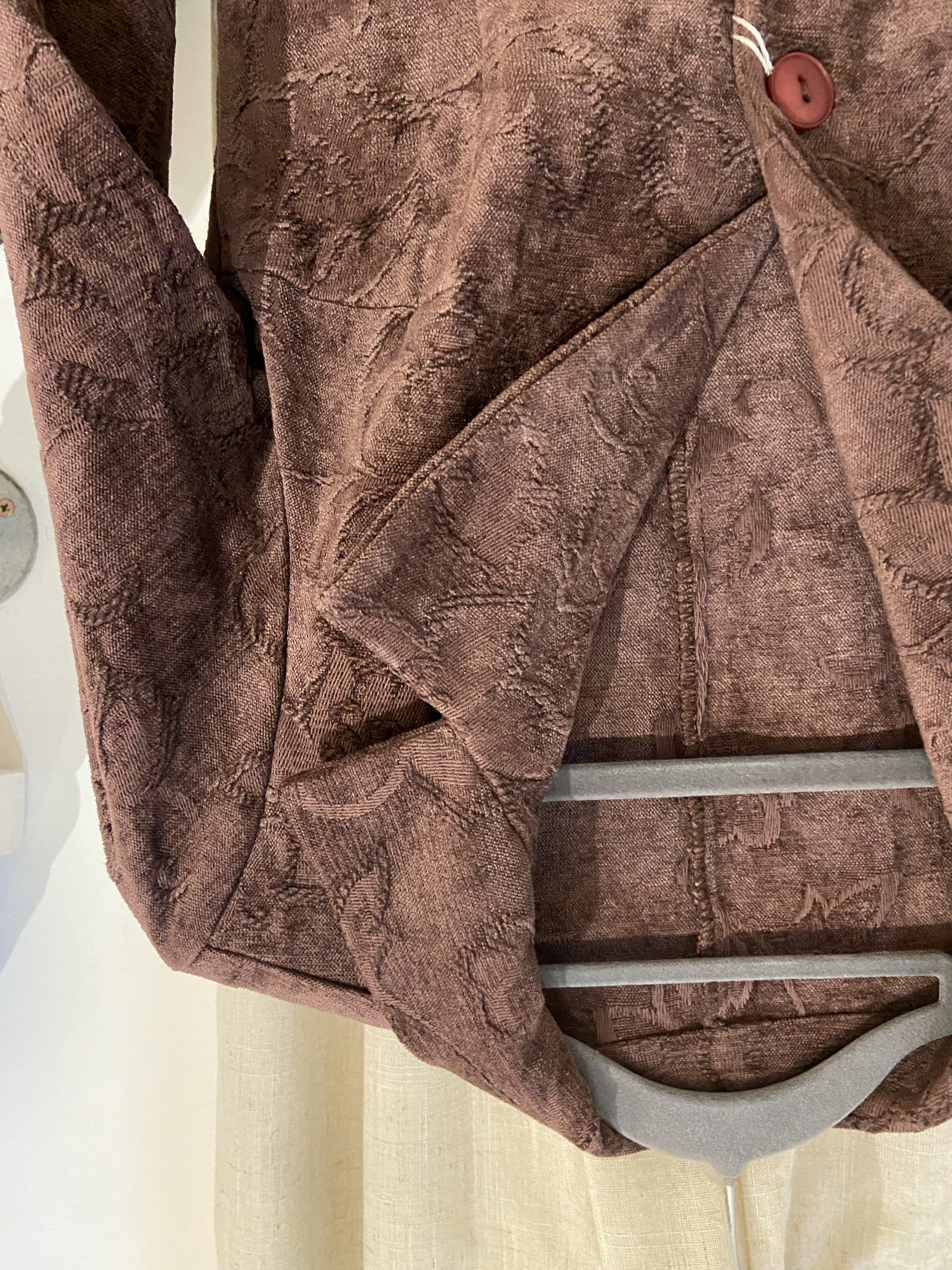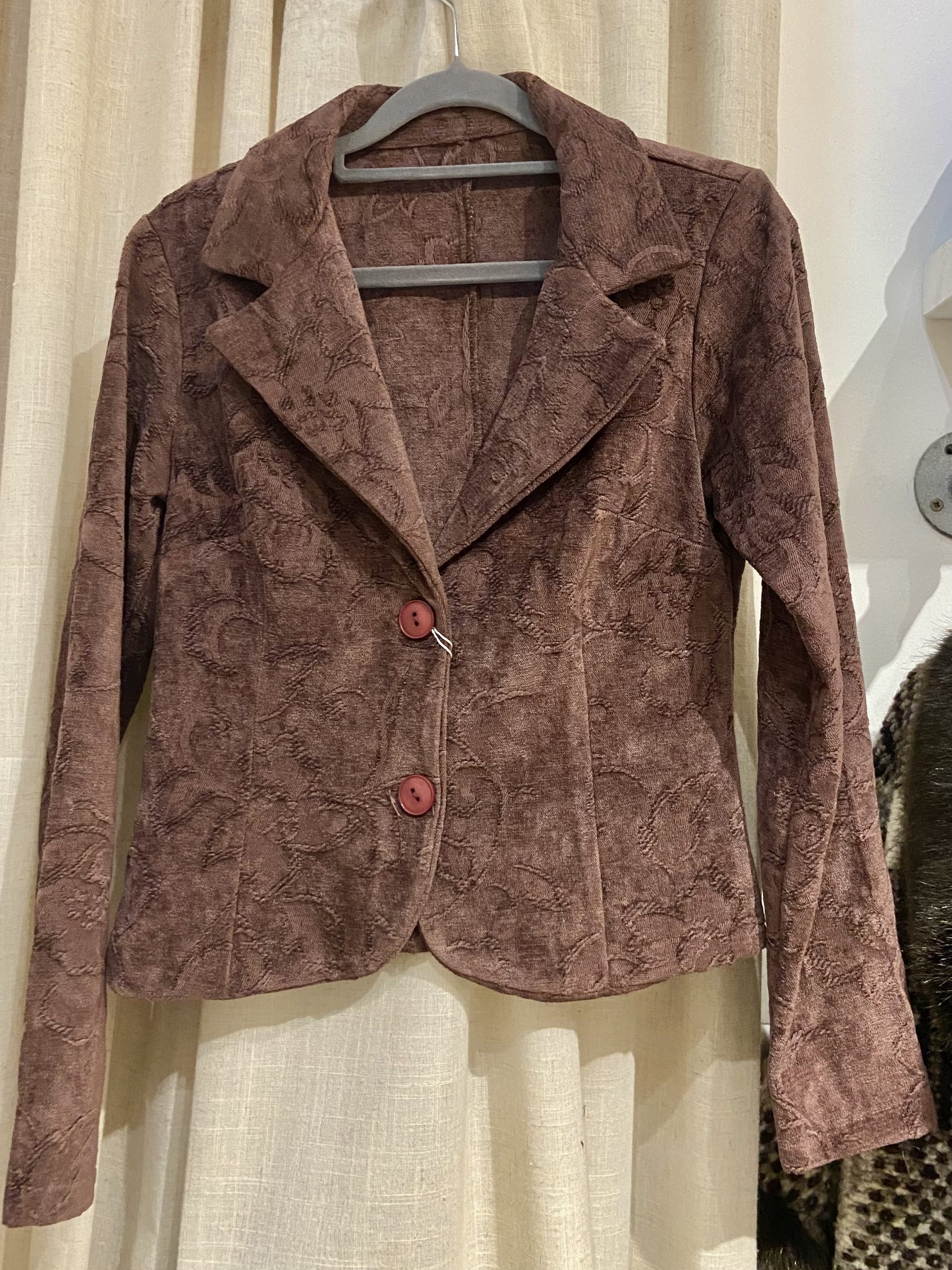Produced in Italy in the late 1990s, this blazer reflects a moment when textured velour jackets in earth tones became a staple of boutique womenswear. Unbranded workshop-made pieces like this were sold through regional designer-led shops, valued for their distinctive fabrics and wearable silhouettes. The embossed velour, warm chestnut tone and softly structured cut give this vintage velour blazer a refined yet easy-to-style feel that works for both day and evening looks.