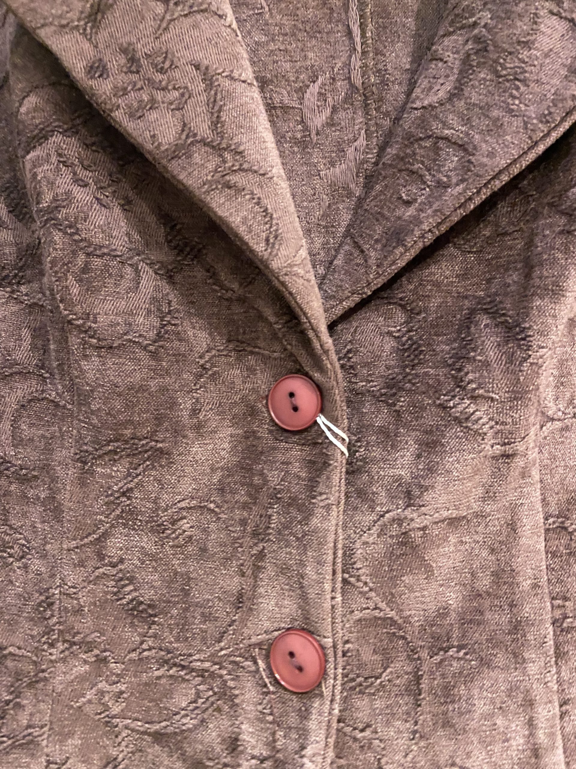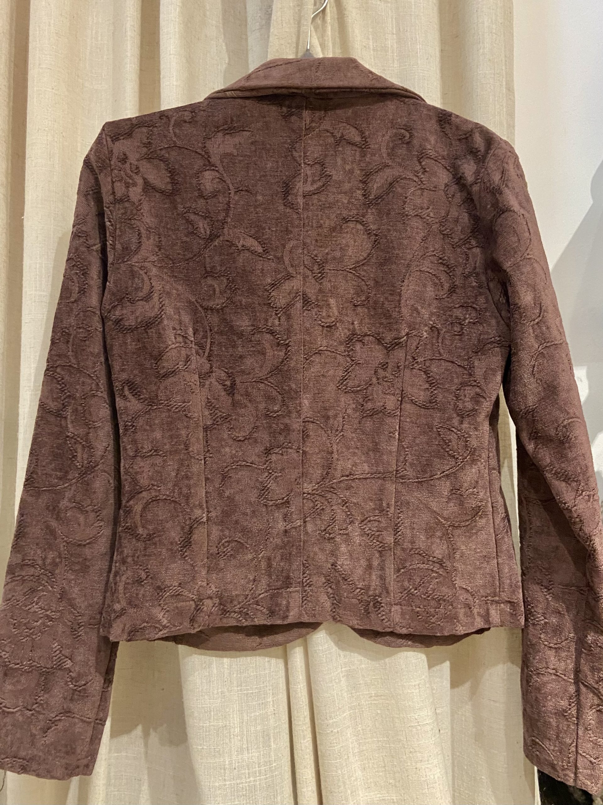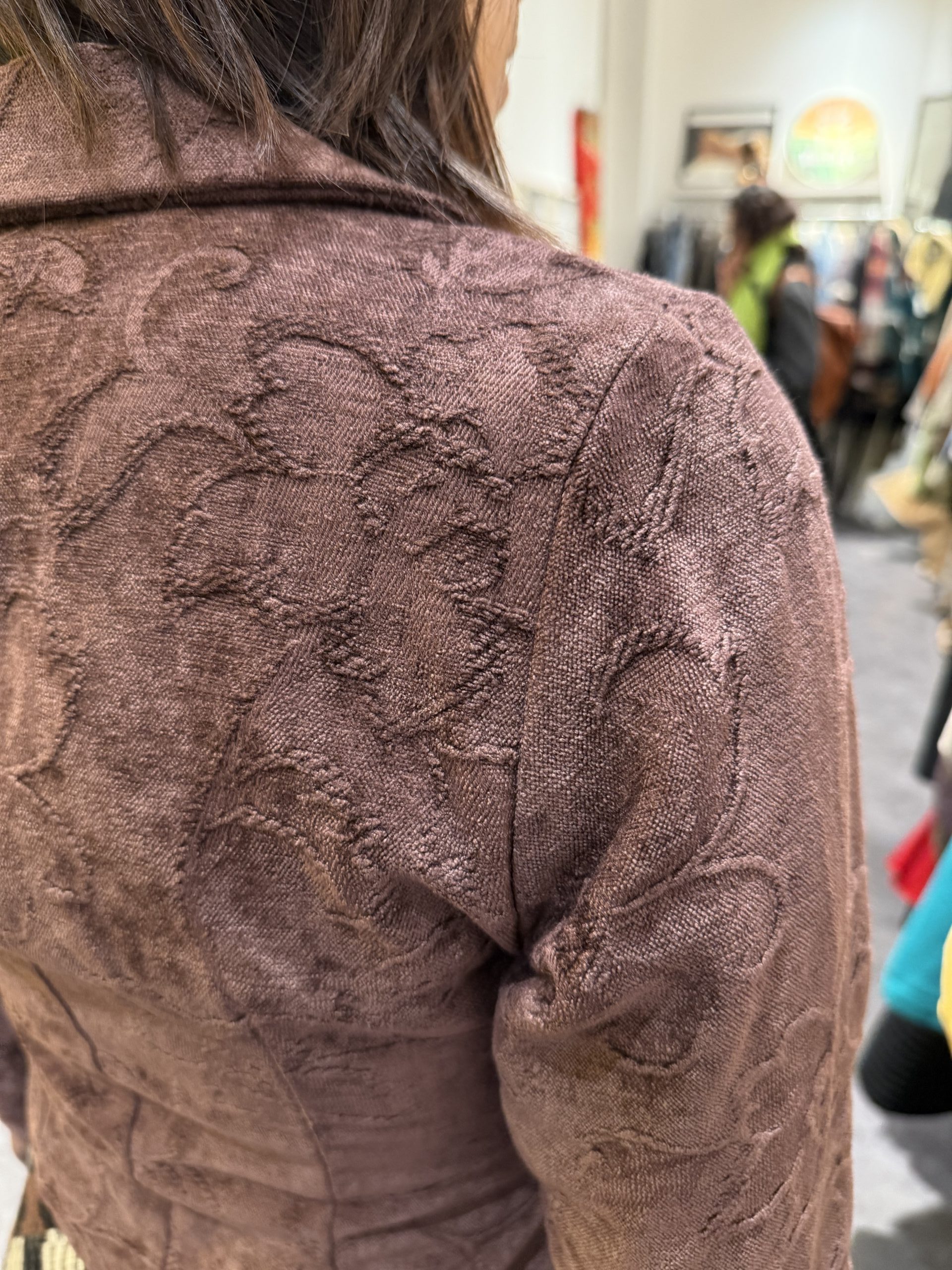 Model wearing 1990s velour blazer in chestnut brown with embossed floral textureLate 1990s Textured Velour Blazer