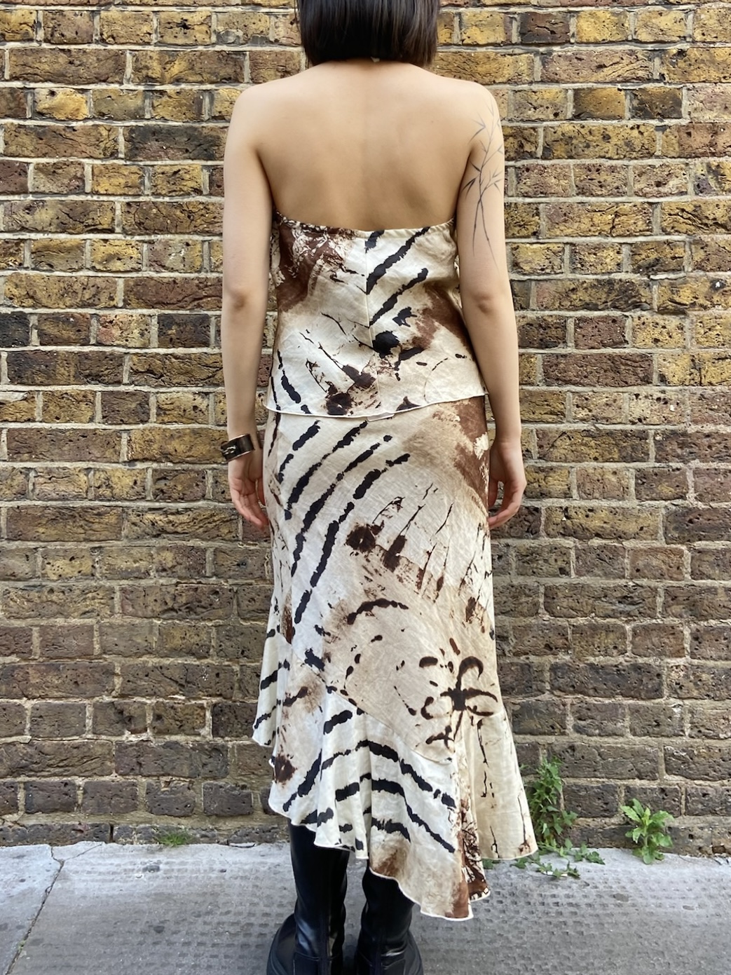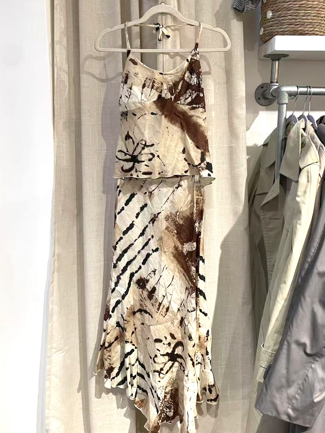 top-out women’s wear appears to be an indie East Asian label, likely from Japan or Korea, active during the early 2000s. The label reflects a period of fashion that embraced asymmetry, raw edges, and artful construction—a move away from mainstream styles in favour of expressive, deconstructed looks. Though the brand doesn’t have known celebrity or media links, this set channels the type of outfit seen in Y2K-era fashion magazines and boutiques that celebrated individuality and non-Western avant-garde aesthetics. Linen blends, often used for their airy structure and visual texture, were a common fabric choice for such labels.