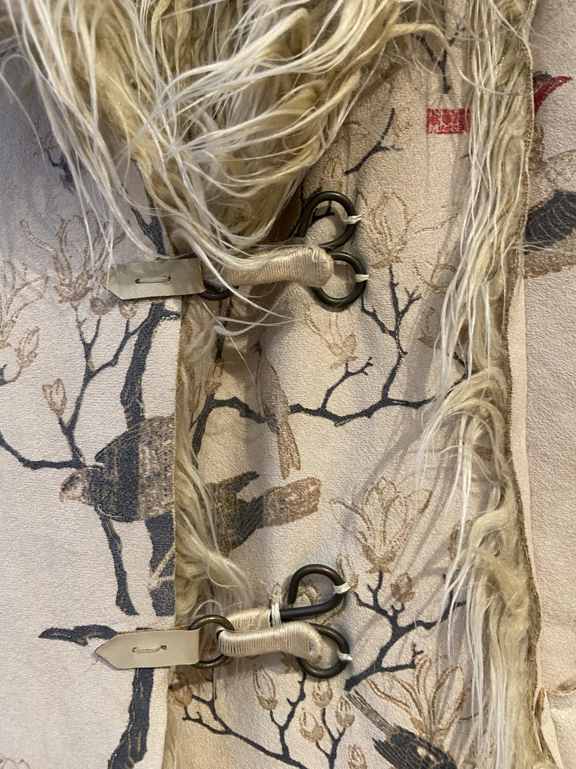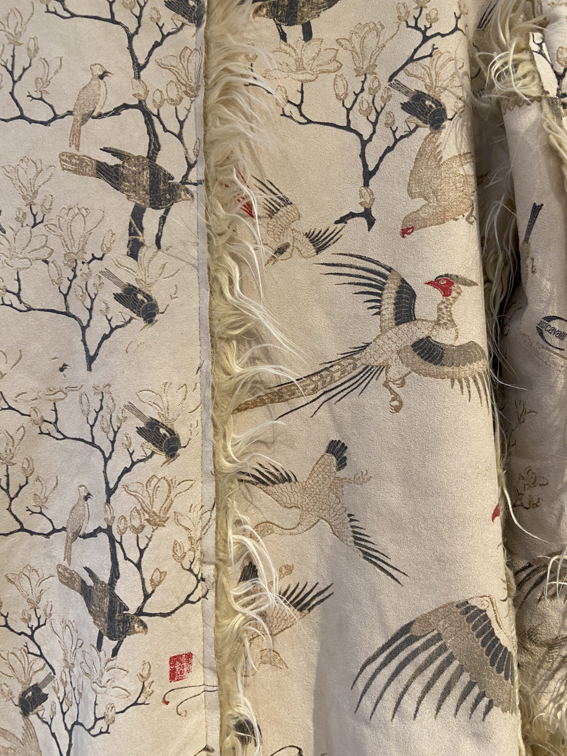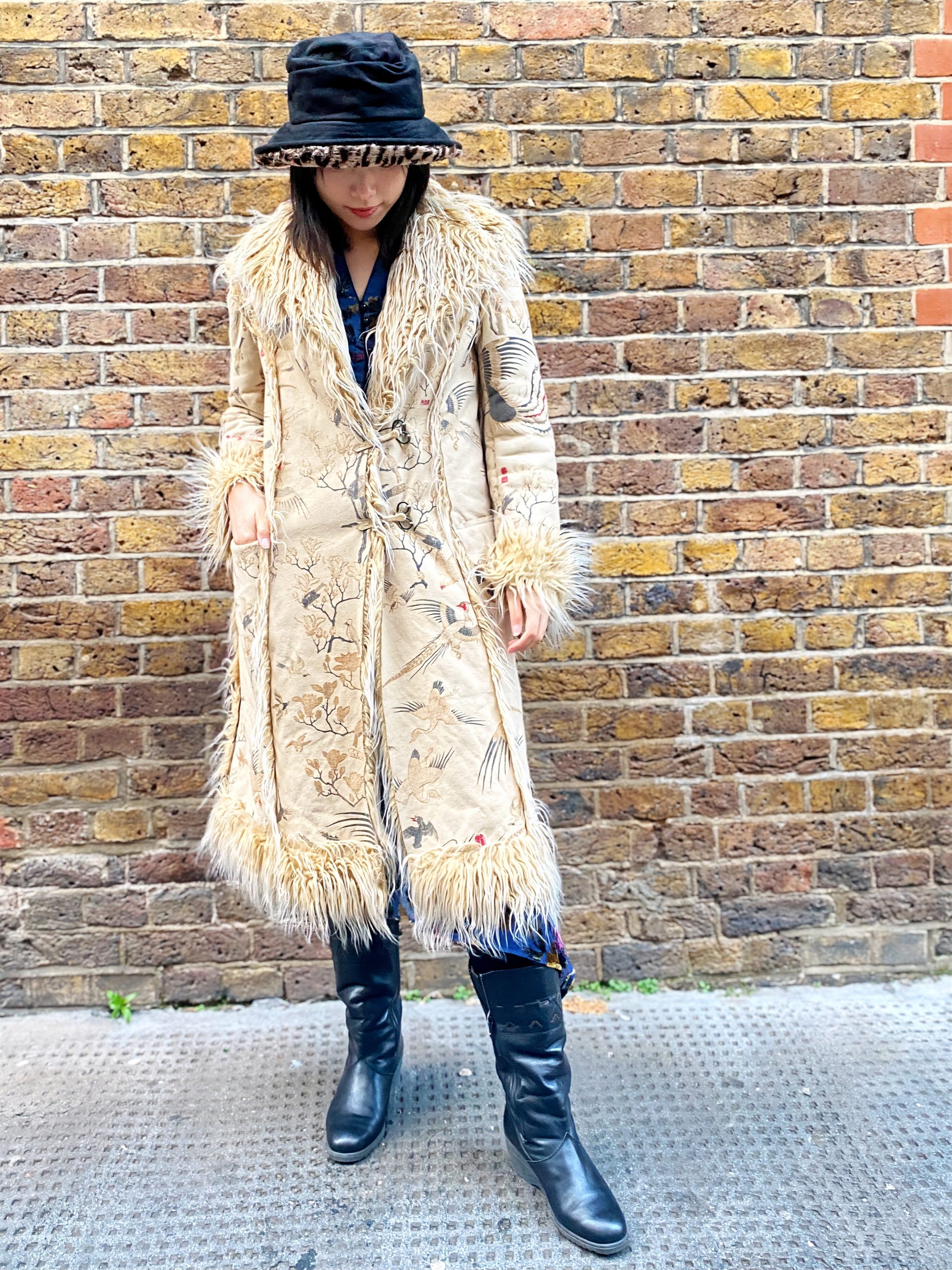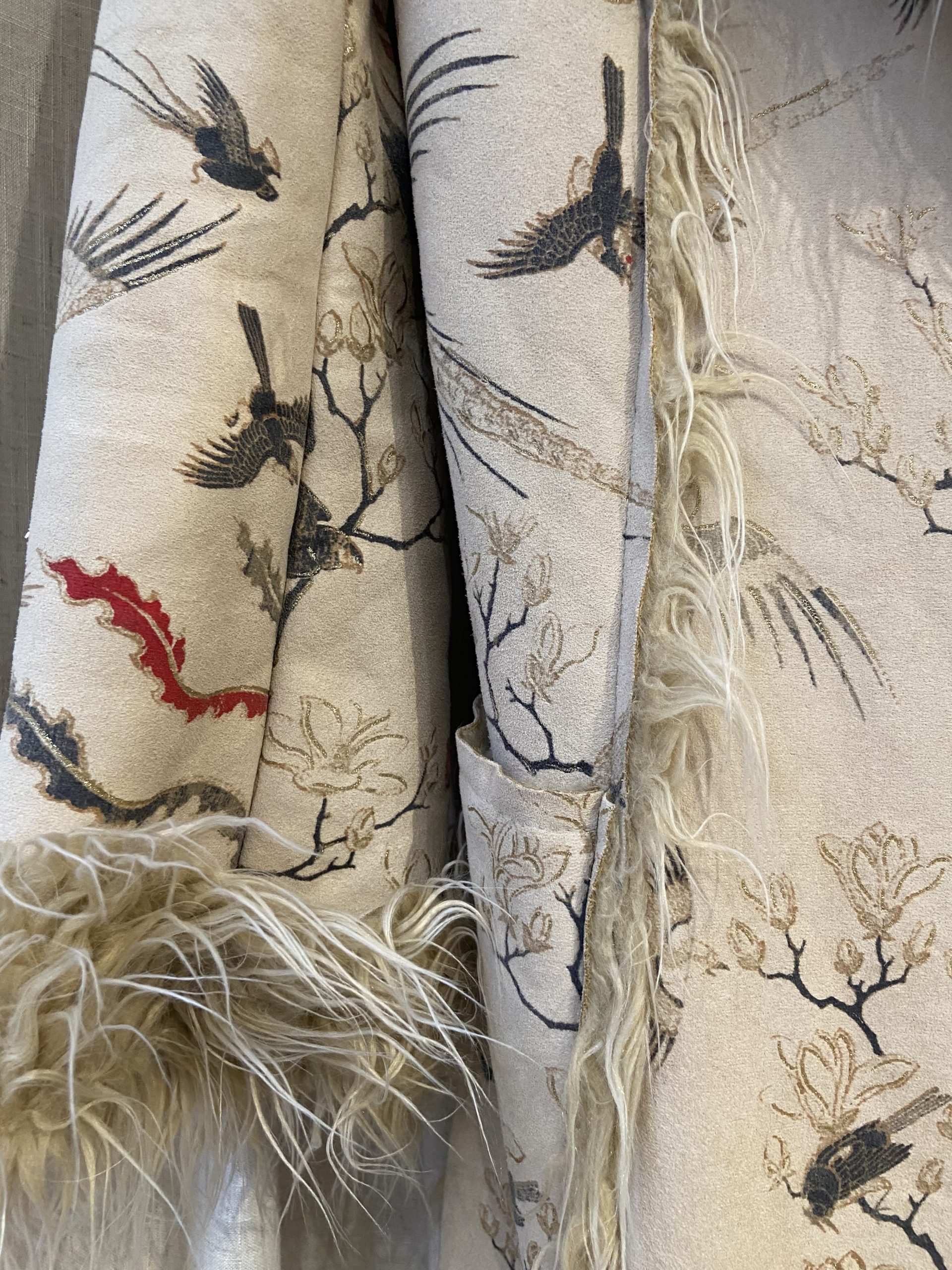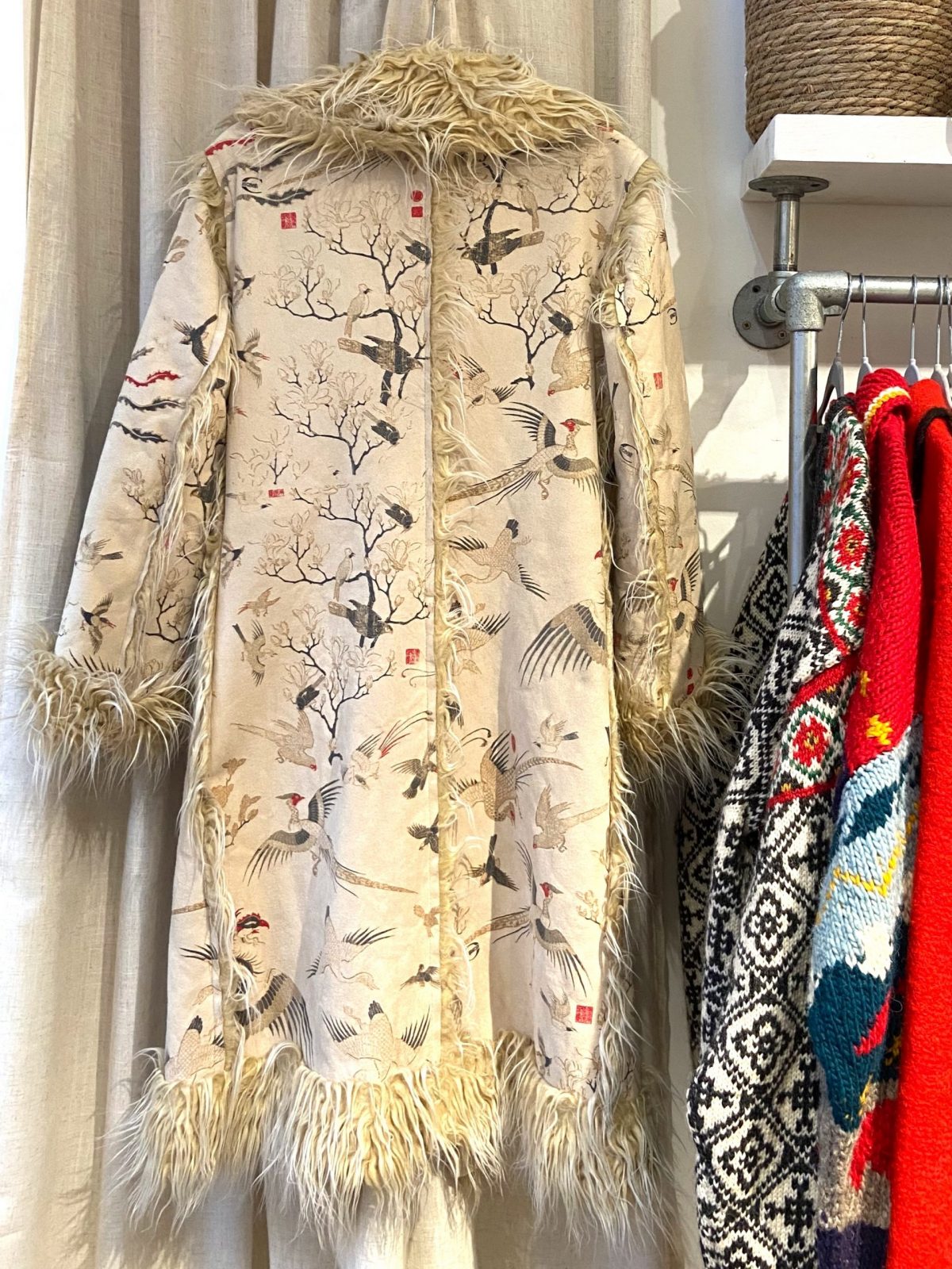 The Just Cavalli coat stands out as a rare example of early 2000s Italian maximalist fashion. Its crane and blossom print pays homage to East Asian artistry, while the faux fur trimming adds the flamboyant Cavalli touch. More than an outerwear garment, this coat is an artwork — dramatic, romantic, and unapologetically glamorous.