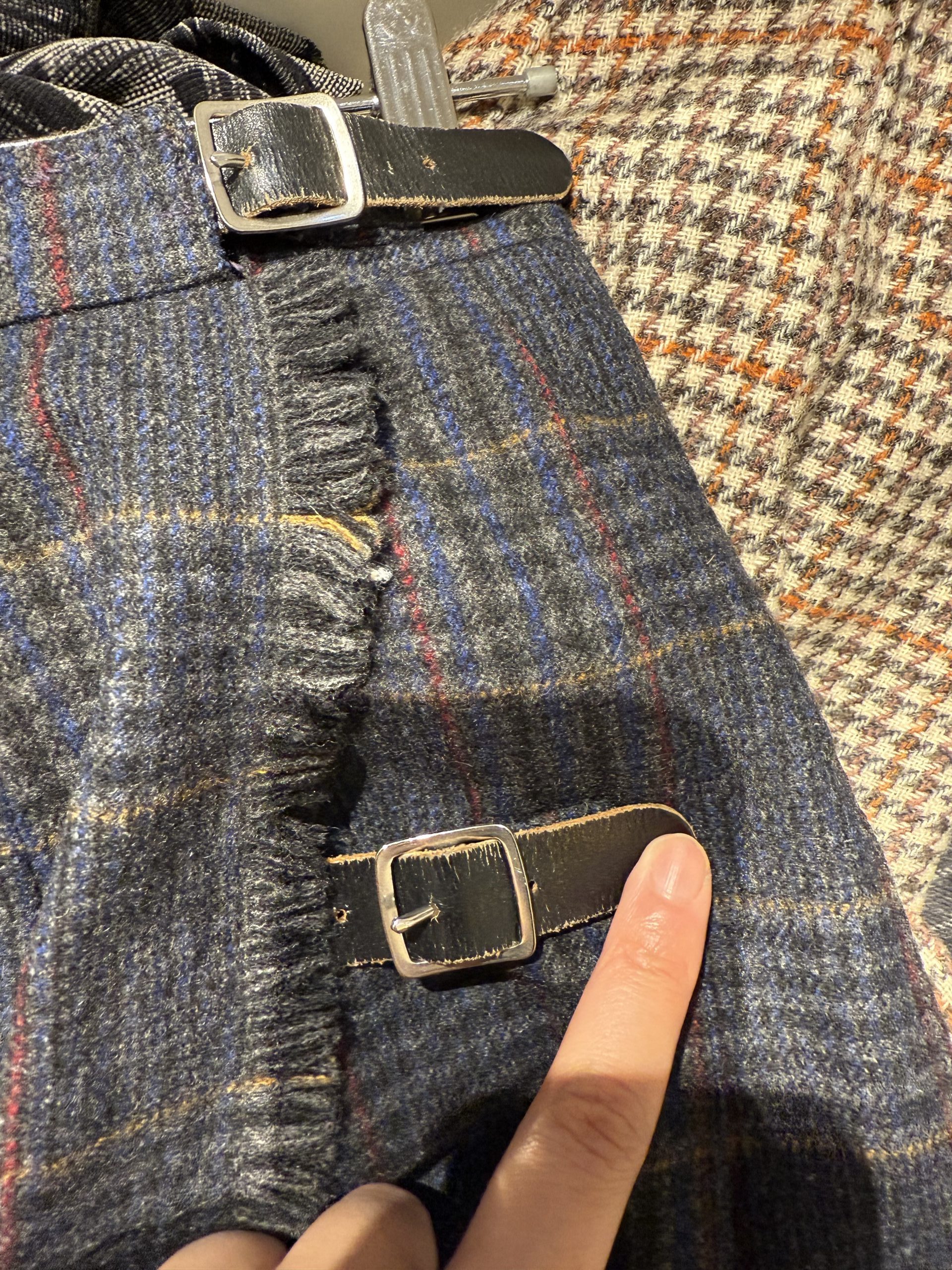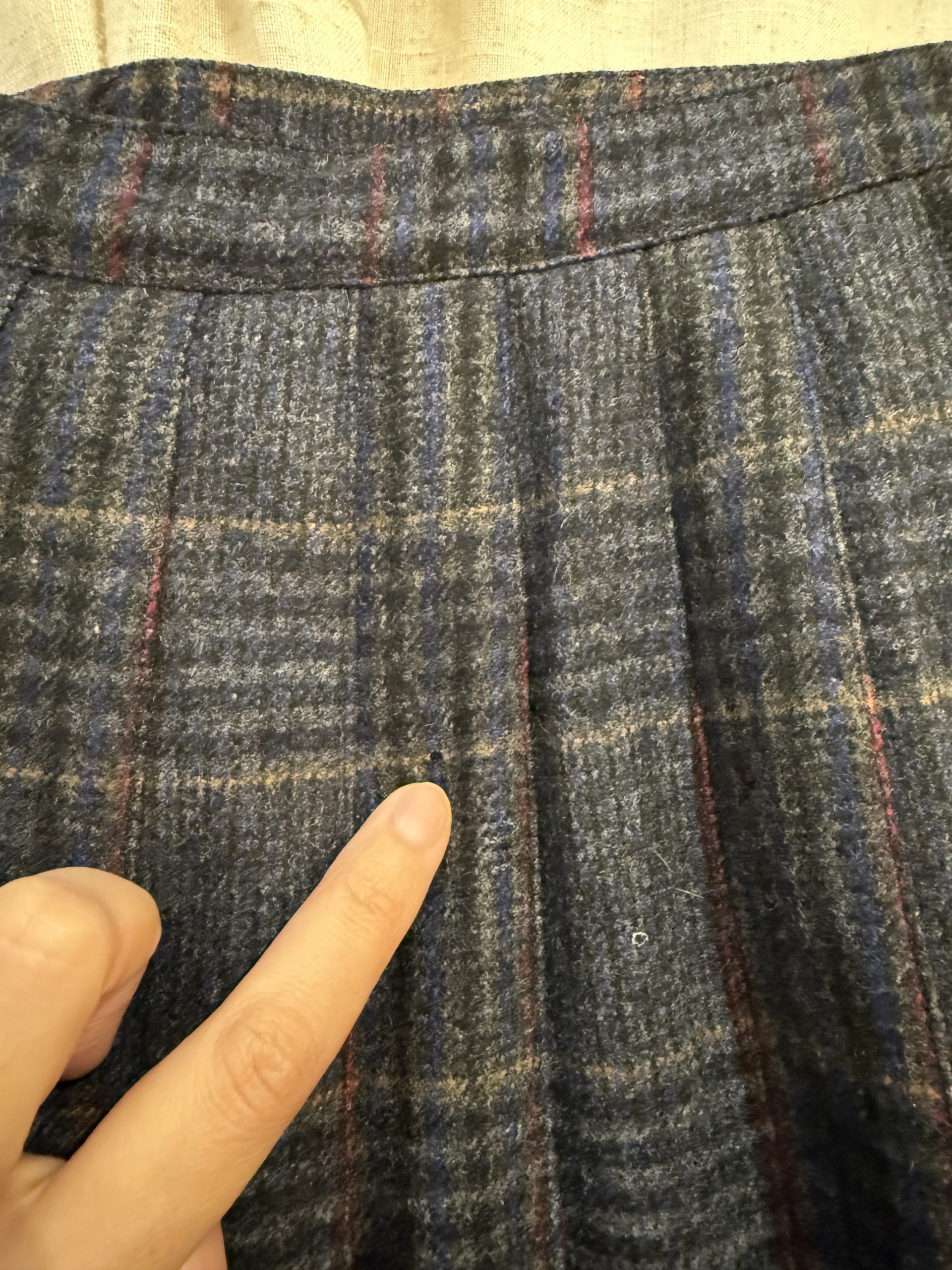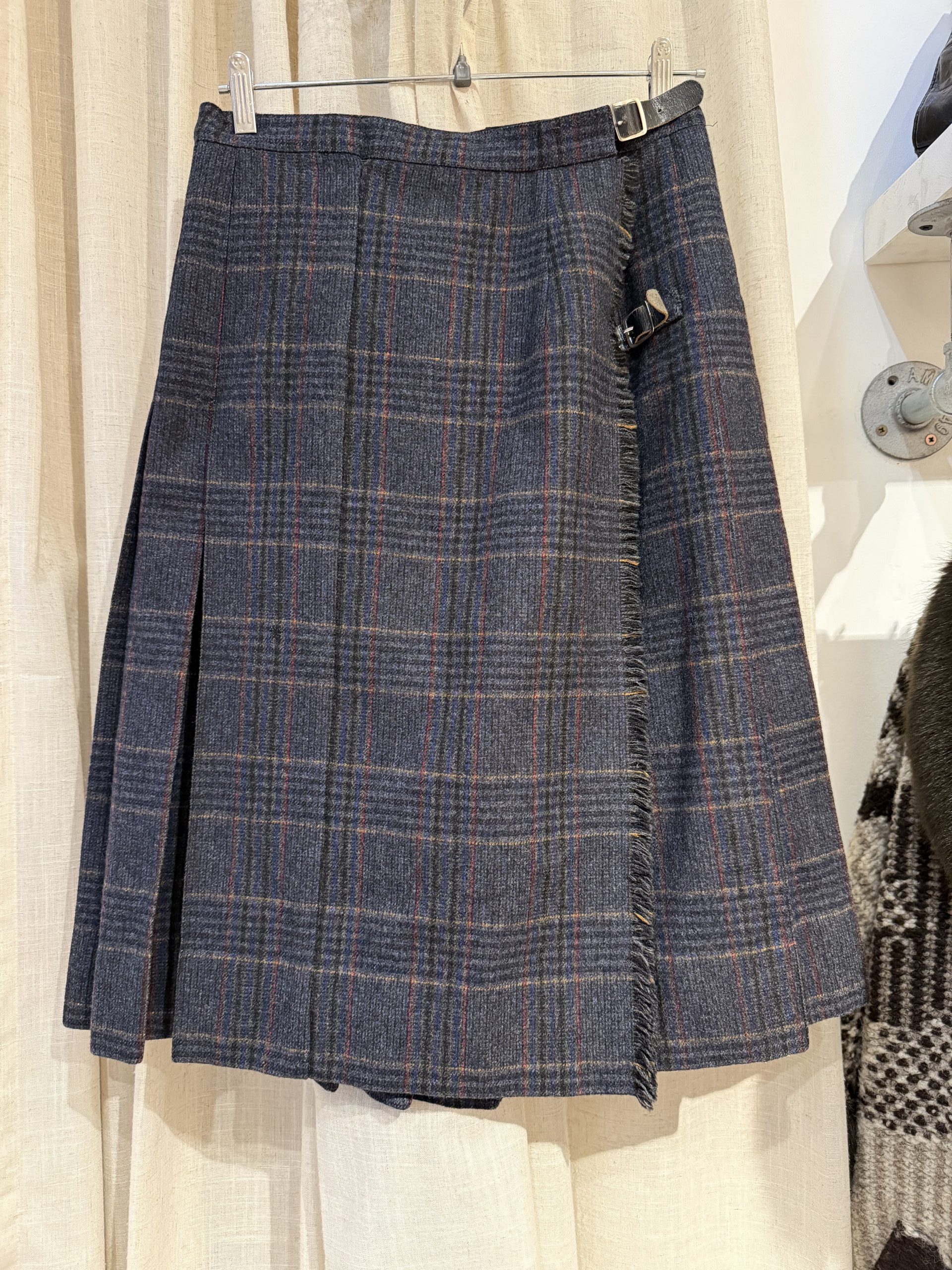 This late 1970s tartan wrap skirt is in good vintage condition. A very tiny hole and a small alteration are present but barely noticeable and do not affect wear. The leather buckle tabs show a gentle age patina consistent with the era.