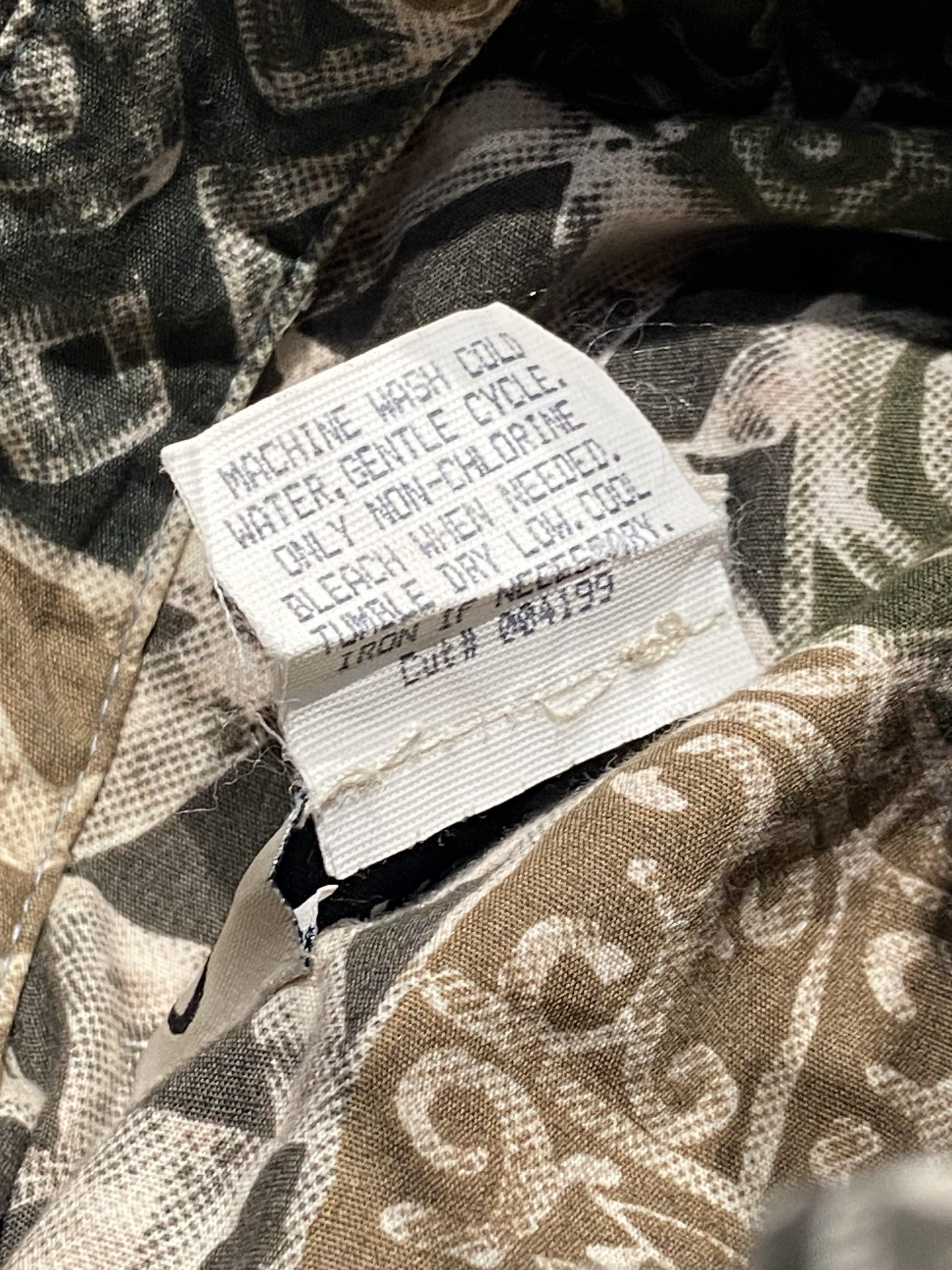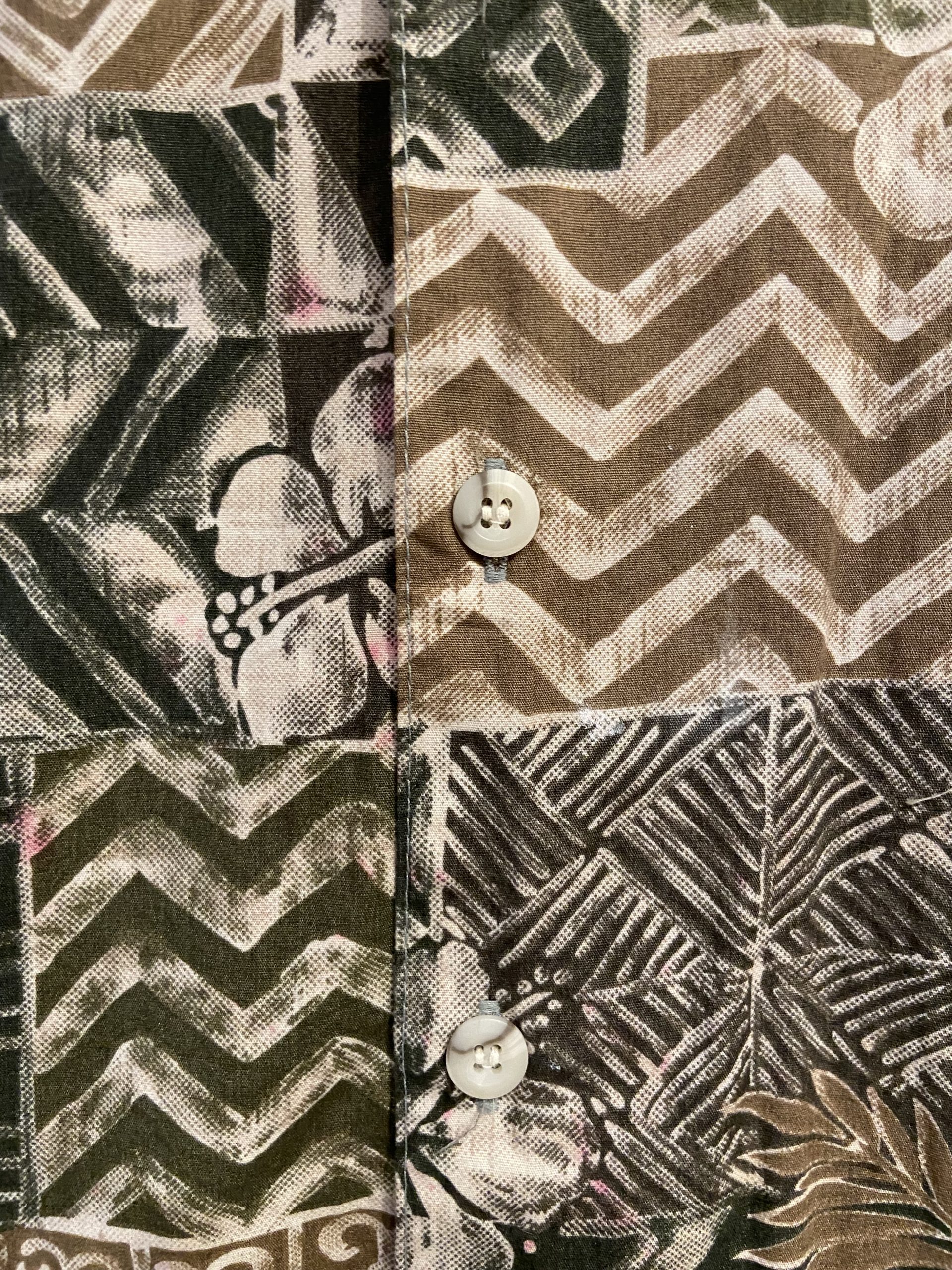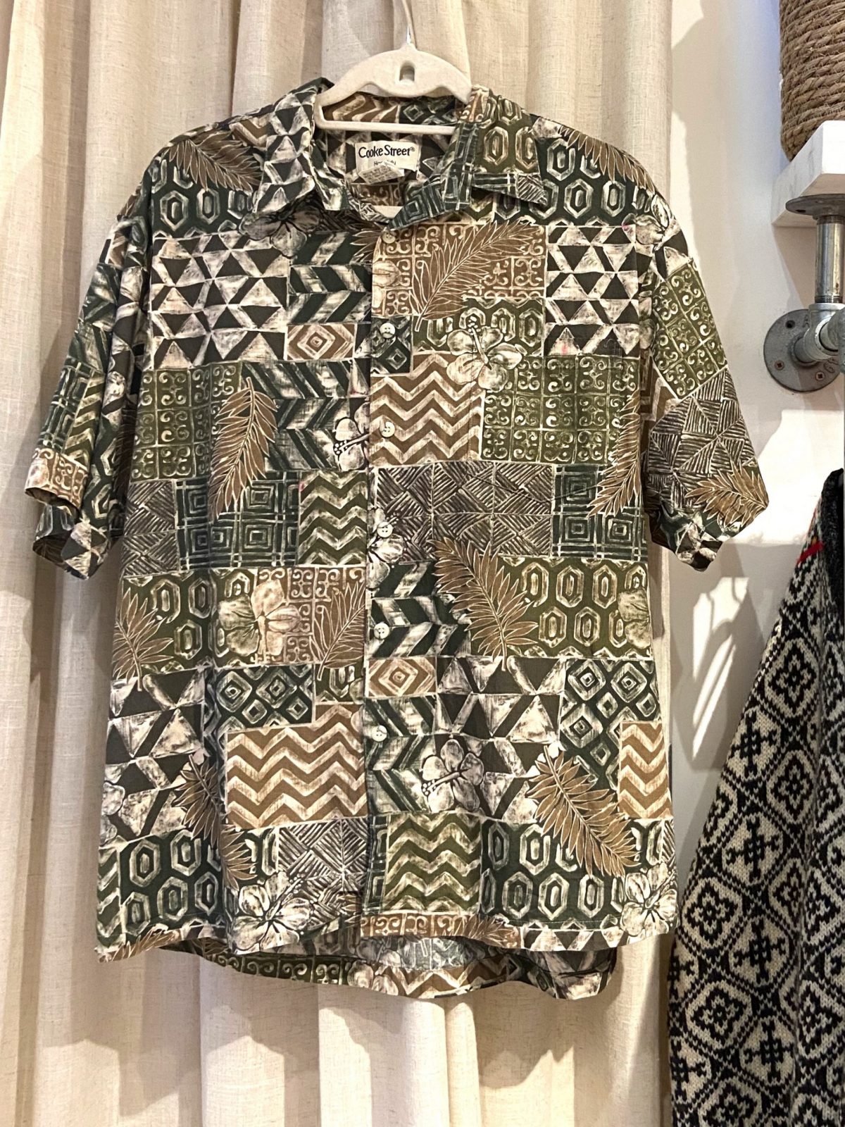 Cooke Street has been crafting quality aloha shirts in Honolulu since the 1970s. This 1980s Hawaiian shirt likely dates to the late decade, identifiable by the typer-style font on the label and the care tag layout—both hallmarks of American-made casualwear from the era. The bold block-print design reflects the vibrant, playful aesthetic of classic islandwear, making it a standout piece for collectors and vintage summer styling.