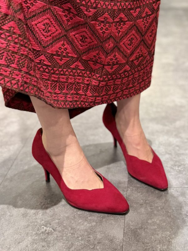 These late 1980s suede heels by Baldinini are sculpted crimson Italian pumps featuring a sharp V-cut vamp, pointed toe, and elegant mid-stiletto silhouette. A striking vintage piece perfect for eveningwear and bold feminine styling.