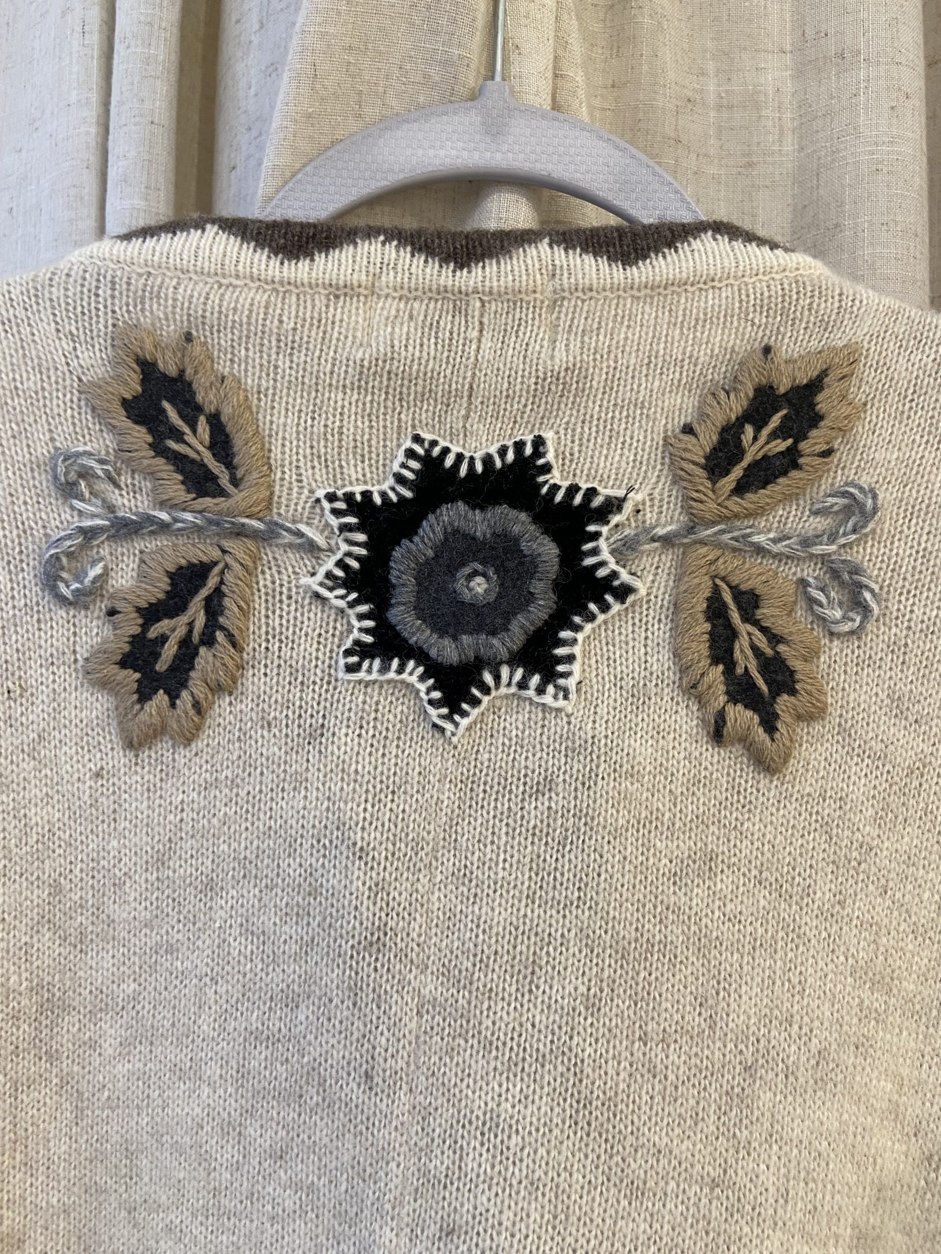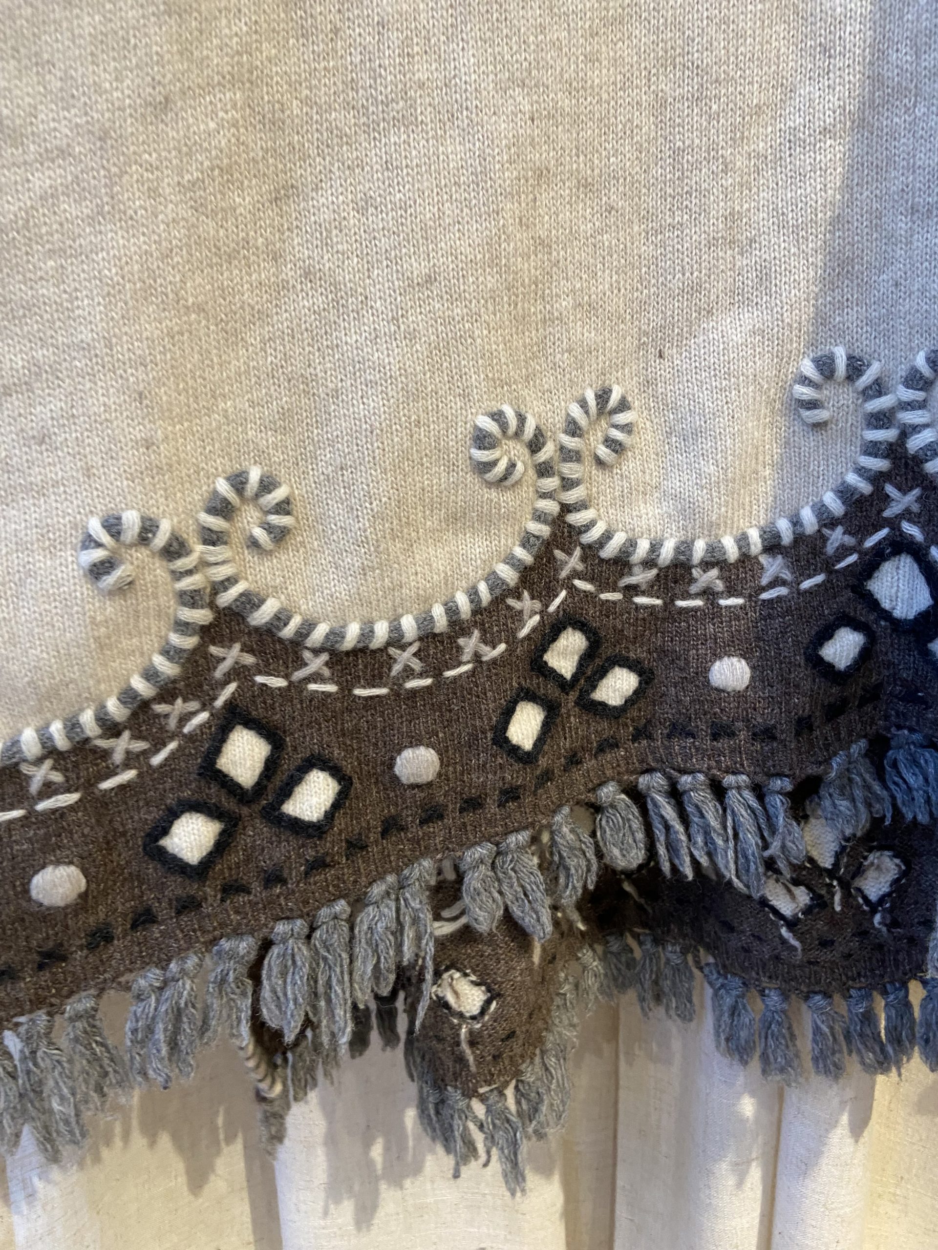 This late 1990s embroidered poncho by Jones reflects the folk-art revival and bohemian styling trends of the late ’90s to early 2000s. During this era, intricate craftsmanship and earthy tones became popular again in response to fast fashion, with many designers embracing vintage silhouettes and global influences. This poncho captures that spirit—blending relaxed comfort with standout detail.